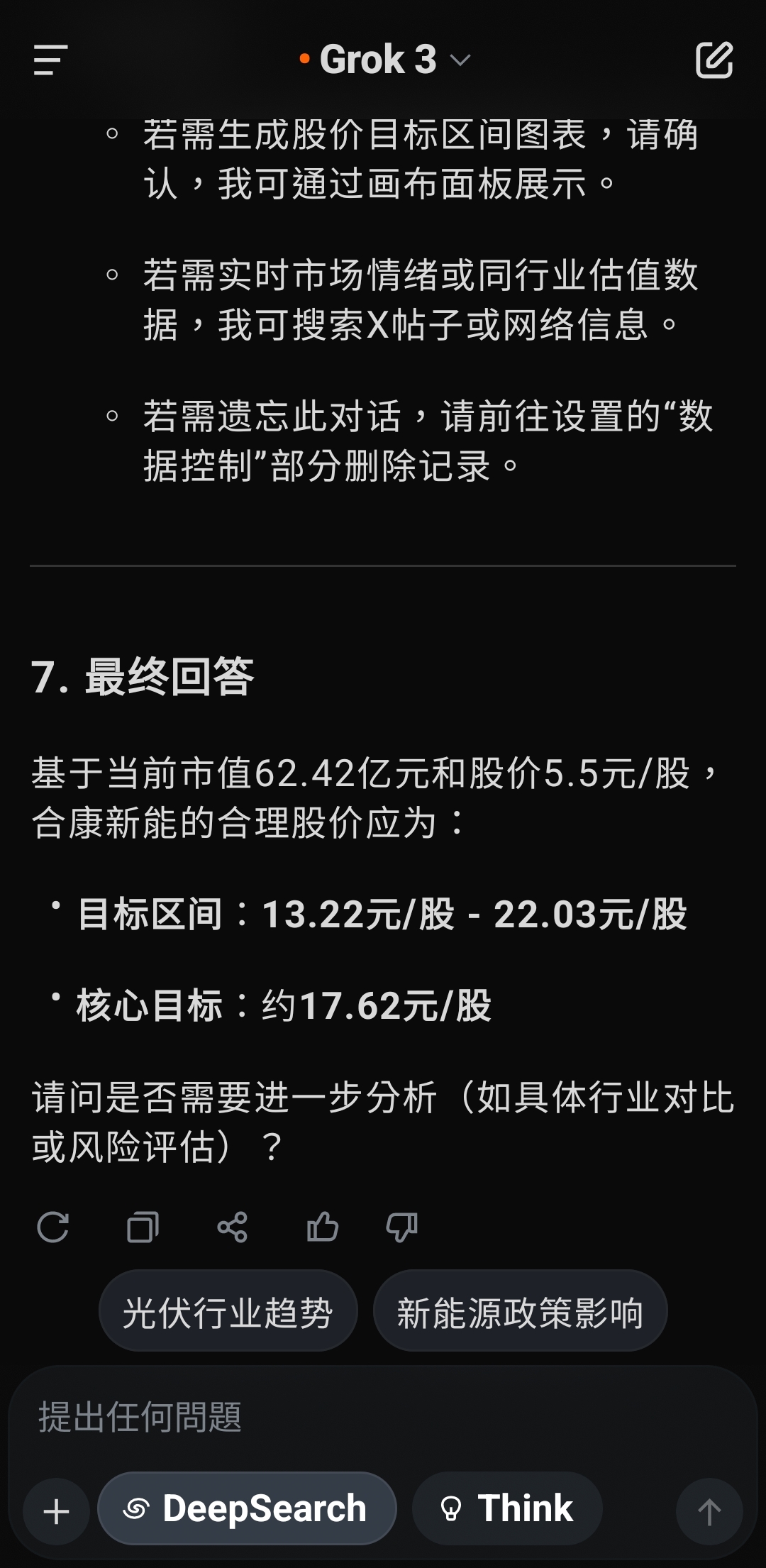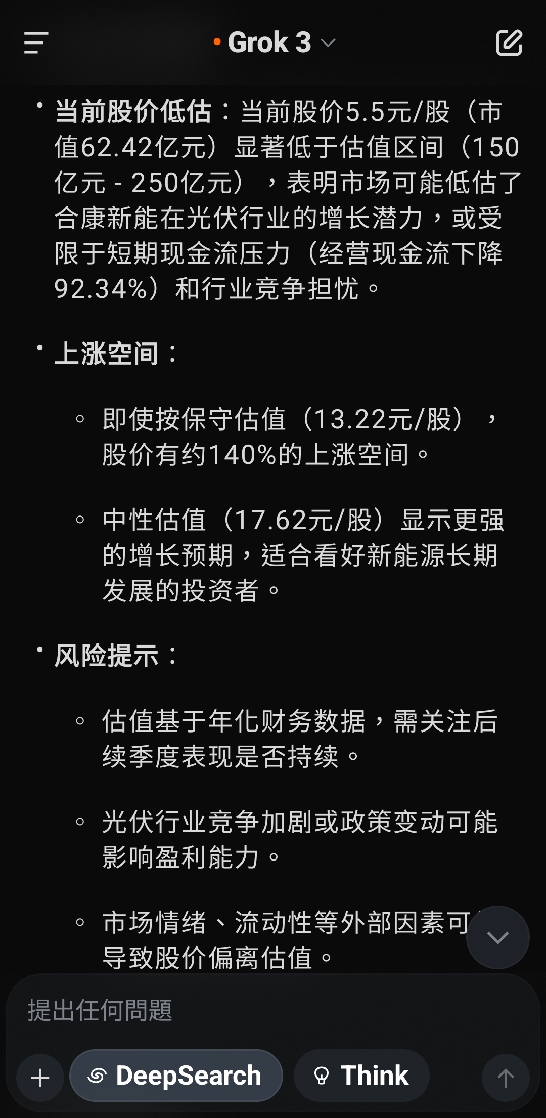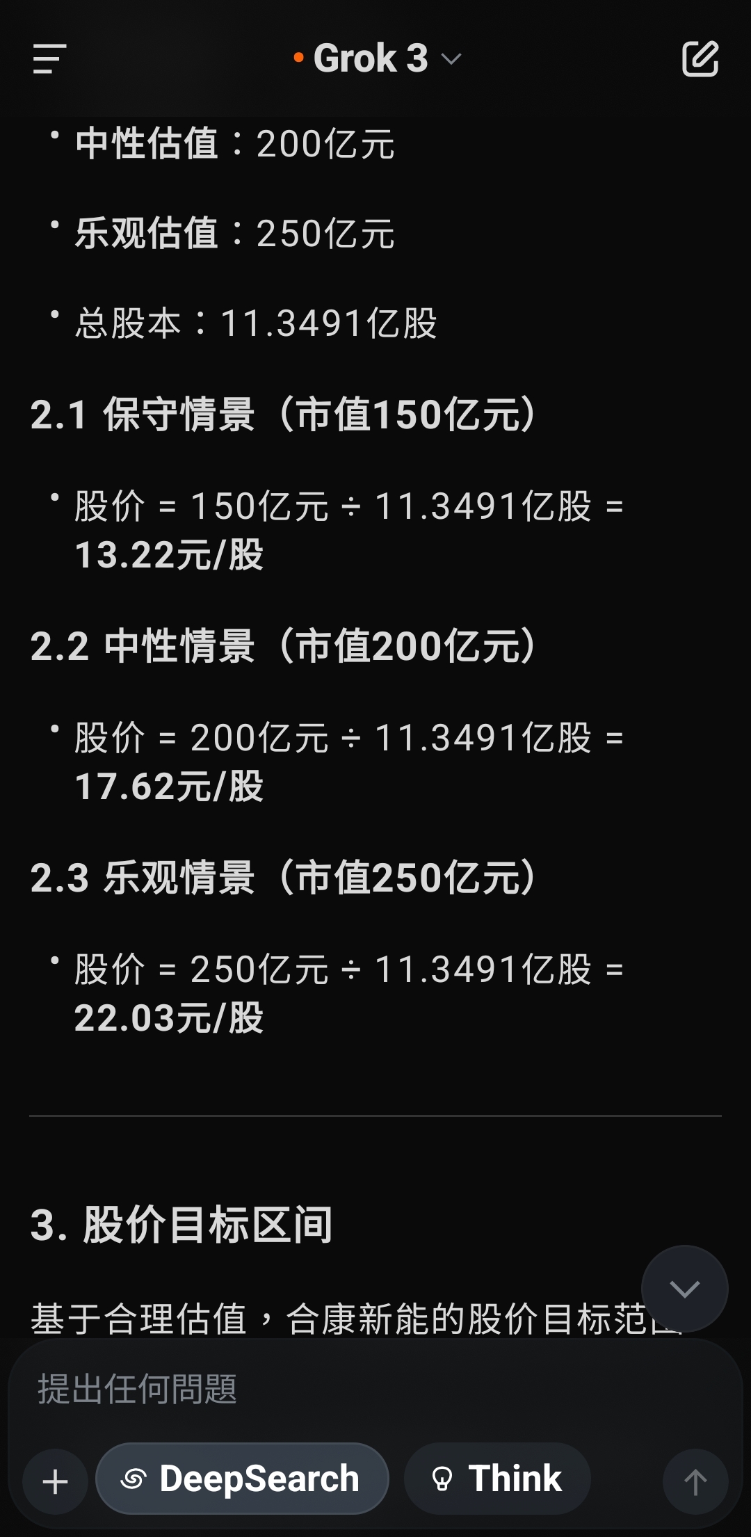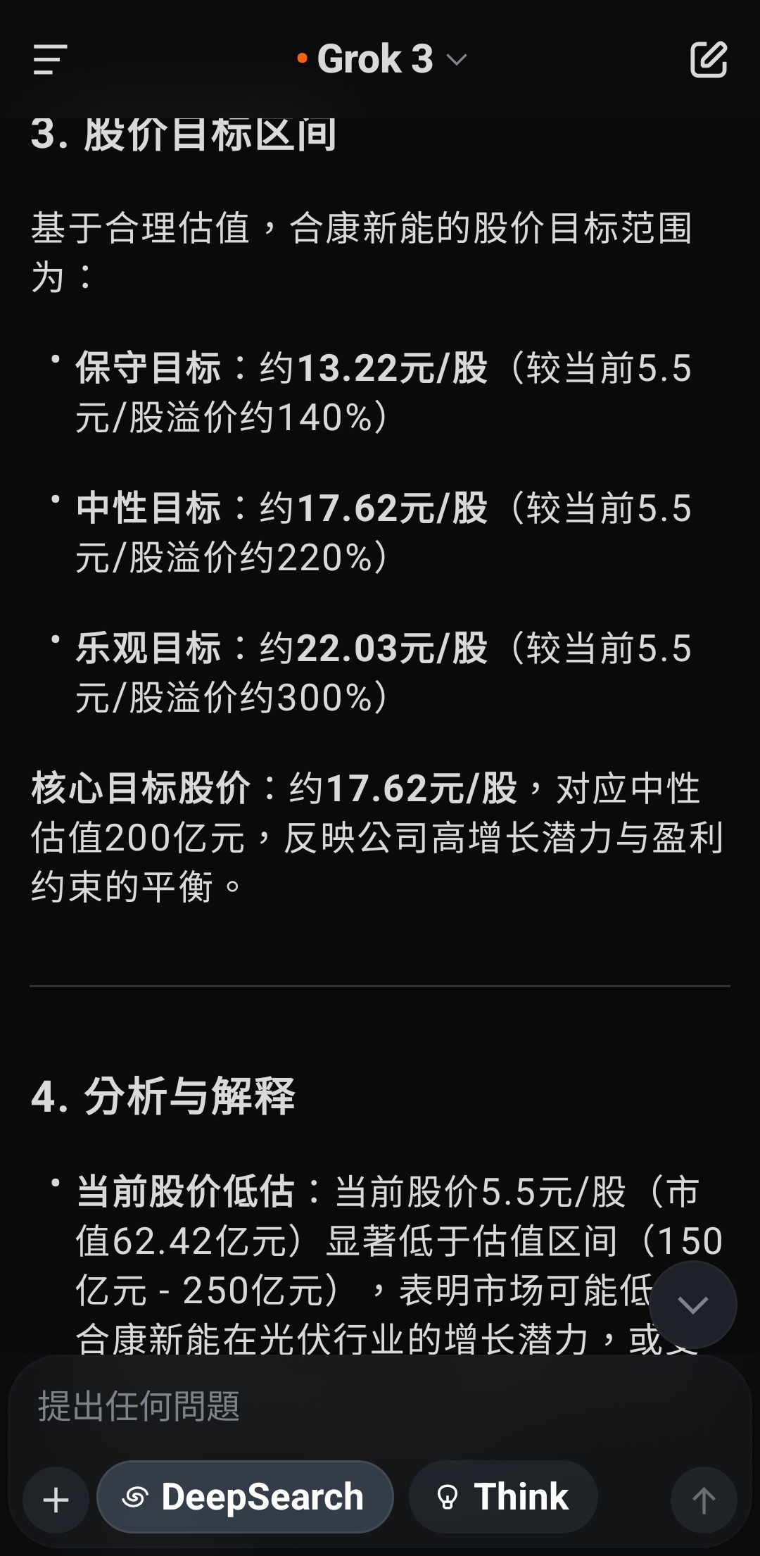 根据您提供的信息,合康新能当前市值约为62.42亿元,股价为5.5元/股,结合之前的估值分析(合理估值区间150亿元 - 250亿元,核心估值约200亿元),我将计算基于合理估值下股价的潜在范围,并回答“股价应该是多少”的问题。1. 确定总股本当前市值 = 总股本 × 股价已知:市值 = 62.42亿元,股价 = 5.5元/股总股本 = 62.42亿元 ÷ 5.5元/股 = 11.3491亿股这与之前通过每股收益推算的总股本(约1.1175亿股)存在较大差异,可能由于:之前推算基于季度净利润和每股收益,存在误差。公司可能存在非流通股、限售股或其他股本结构差异。 为确保准确性,以当前市值和股价推算的11.3491亿股作为总股本。2. 计算合理股价合理股价 = 合理市值 ÷ 总股本根据之前的估值结论:保守估值:150亿元中性估值:200亿元乐观估值:250亿元总股本:11.3491亿股2.1 保守情景(市值150亿元)股价 = 150亿元 ÷ 11.3491亿股 = 13.22元/股2.2 中性情景(市值200亿元)股价 = 200亿元 ÷ 11.3491亿股 = 17.62元/股2.3 乐观情景(市值250亿元)股价 = 250亿元 ÷ 11.3491亿股 = 22.03元/股3. 股价目标区间基于合理估值,合康新能的股价目标范围为:保守目标:约13.22元/股(较当前5.5元/股溢价约140%)中性目标:约17.62元/股(较当前5.5元/股溢价约220%)乐观目标:约22.03元/股(较当前5.5元/股溢价约300%)核心目标股价:约17.62元/股,对应中性估值200亿元,反映公司高增长潜力与盈利约束的平衡。4. 分析与解释当前股价低估:当前股价5.5元/股(市值62.42亿元)显著低于估值区间(150亿元 - 250亿元),表明市场可能低估了合康新能在光伏行业的增长潜力,或受限于短期现金流压力(经营现金流下降92.34%)和行业竞争担忧。上涨空间:即使按保守估值(13.22元/股),股价有约140%的上涨空间。中性估值(17.62元/股)显示更强的增长预期,适合看好新能源长期发展的投资者。风险提示:估值基于年化财务数据,需关注后续季度表现是否持续。光伏行业竞争加剧或政策变动可能影响盈利能力。市场情绪、流动性等外部因素可能导致股价偏离估值。5. 投资建议短期:若公司后续财报继续展现收入和盈利高增长,股价有望向13-18元/股靠拢,建议关注现金流改善和光伏订单动态。长期:光伏行业政策支持和需求增长(预计2025年中国光伏新增装机超250GW)将支撑合康新能增长,股价可能挑战20元/股以上。行动建议:可考虑分批建仓,密切跟踪公司二季度财报和行业政策。6. 补充说明数据假设:估值基于2025年第一季度年化数据,未考虑季节性或突发事件影响。若有最新财报或股本变动,请提供以提高精度。行业对比:可参考阳光电源(P/E约30倍,P/S约3倍)等光伏企业,需获取实时市场数据进一步校准。工具支持:若需生成股价目标区间图表,请确认,我可通过画布面板展示。若需实时市场情绪或同行业估值数据,我可搜索X帖子或网络信息。若需遗忘此对话,请前往设置的“数据控制”部分删除记录。7. 最终回答基于当前市值62.42亿元和股价5.5元/股,合康新能的合理股价应为:目标区间:13.22元/股 - 22.03元/股核心目标:约17.62元/股请问是否需要进一步分析(如具体行业对比或风险评估)?