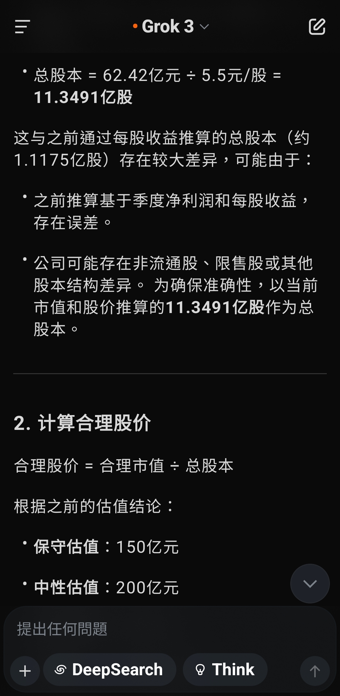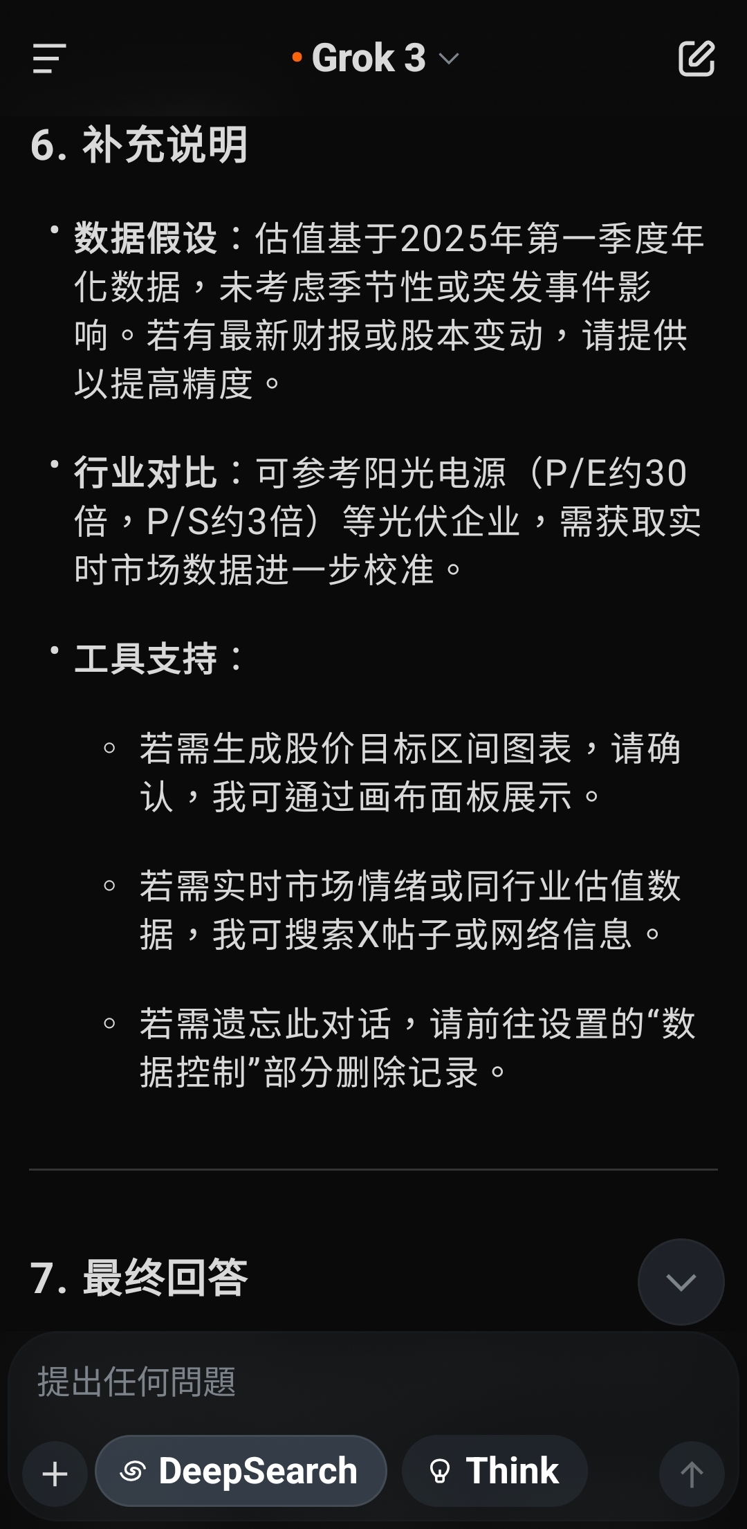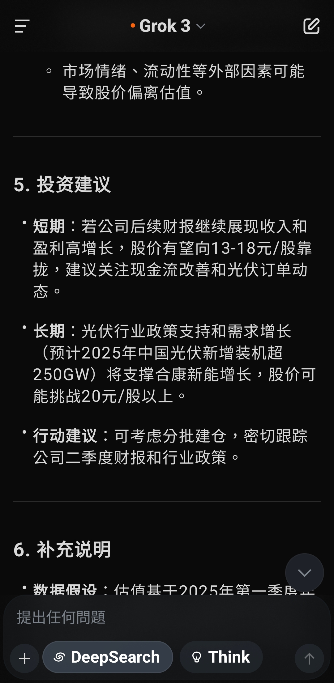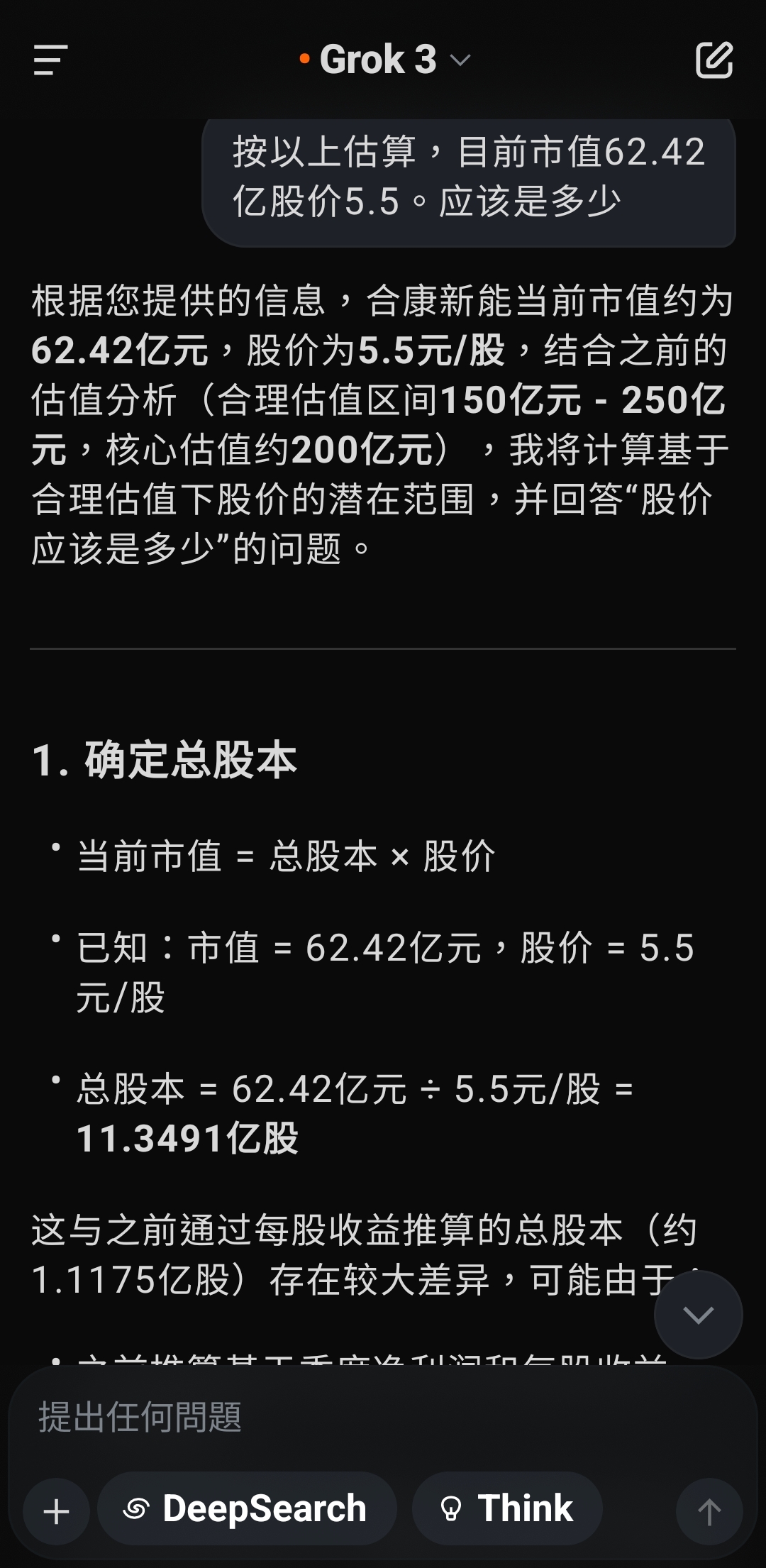 根据您提供的信息,合康新能当前市值约为62.42亿元,股价为5.5元/股,结合之前的估值分析(合理估值区间150亿元 - 250亿元,核心估值约200亿元),我将计算基于合理估值下股价的潜在范围,并回答“股价应该是多少”的问题。1. 确定总股本当前市值 = 总股本 × 股价已知:市值 = 62.42亿元,股价 = 5.5元/股总股本 = 62.42亿元 ÷ 5.5元/股 = 11.3491亿股这与之前通过每股收益推算的总股本(约1.1175亿股)存在较大差异,可能由于:之前推算基于季度净利润和每股收益,存在误差。公司可能存在非流通股、限售股或其他股本结构差异。 为确保准确性,以当前市值和股价推算的11.3491亿股作为总股本。2. 计算合理股价合理股价 = 合理市值 ÷ 总股本根据之前的估值结论:保守估值:150亿元中性估值:200亿元乐观估值:250亿元总股本:11.3491亿股2.1 保守情景(市值150亿元)股价 = 150亿元 ÷ 11.3491亿股 = 13.22元/股2.2 中性情景(市值200亿元)股价 = 200亿元 ÷ 11.3491亿股 = 17.62元/股2.3 乐观情景(市值250亿元)股价 = 250亿元 ÷ 11.3491亿股 = 22.03元/股3. 股价目标区间基于合理估值,合康新能的股价目标范围为:保守目标:约13.22元/股(较当前5.5元/股溢价约140%)中性目标:约17.62元/股(较当前5.5元/股溢价约220%)乐观目标:约22.03元/股(较当前5.5元/股溢价约300%)核心目标股价:约17.62元/股,对应中性估值200亿元,反映公司高增长潜力与盈利约束的平衡。4. 分析与解释当前股价低估:当前股价5.5元/股(市值62.42亿元)显著低于估值区间(150亿元 - 250亿元),表明市场可能低估了合康新能在光伏行业的增长潜力,或受限于短期现金流压力(经营现金流下降92.34%)和行业竞争担忧。上涨空间:即使按保守估值(13.22元/股),股价有约140%的上涨空间。中性估值(17.62元/股)显示更强的增长预期,适合看好新能源长期发展的投资者。风险提示:估值基于年化财务数据,需关注后续季度表现是否持续。光伏行业竞争加剧或政策变动可能影响盈利能力。市场情绪、流动性等外部因素可能导致股价偏离估值。5. 投资建议短期:若公司后续财报继续展现收入和盈利高增长,股价有望向13-18元/股靠拢,建议关注现金流改善和光伏订单动态。长期:光伏行业政策支持和需求增长(预计2025年中国光伏新增装机超250GW)将支撑合康新能增长,股价可能挑战20元/股以上。行动建议:可考虑分批建仓,密切跟踪公司二季度财报和行业政策。6. 补充说明数据假设:估值基于2025年第一季度年化数据,未考虑季节性或突发事件影响。若有最新财报或股本变动,请提供以提高精度。行业对比:可参考阳光电源(P/E约30倍,P/S约3倍)等光伏企业,需获取实时市场数据进一步校准。工具支持:若需生成股价目标区间图表,请确认,我可通过画布面板展示。若需实时市场情绪或同行业估值数据,我可搜索X帖子或网络信息。若需遗忘此对话,请前往设置的“数据控制”部分删除记录。7. 最终回答基于当前市值62.42亿元和股价5.5元/股,合康新能的合理股价应为:目标区间:13.22元/股 - 22.03元/股核心目标:约17.62元/股请问是否需要进一步分析(如具体行业对比或风险评估)?