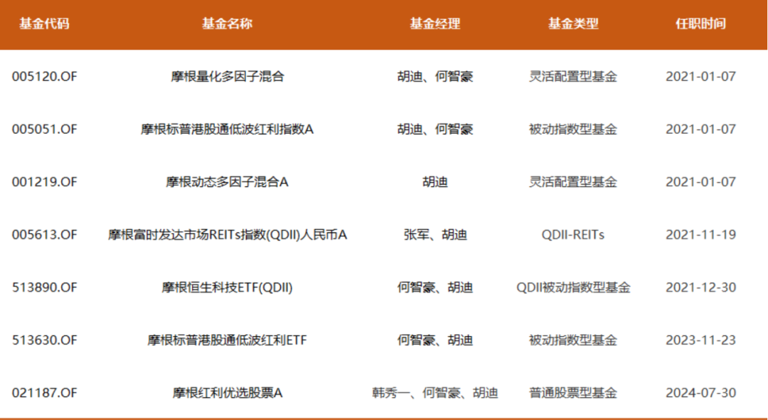 Wind数据显示,其目前共管理7只公募基金,其中包括摩根标普港股通低波红利ETF等被动指数ETF,也包含摩根红利优选等主动量化基金。