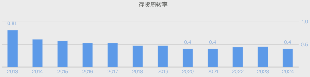 2024年,洋河股份存货周转率再度降至0.4次,为近10年来最低,2020年、2021年曾连续两年出现这种情况,前三季度更是只有0.38次。对比省内劲敌今世缘,2024年前三季度存货周转率为0.53次,这也意味着今世缘的存货周转比洋河快了大半年的时间(约268天)。