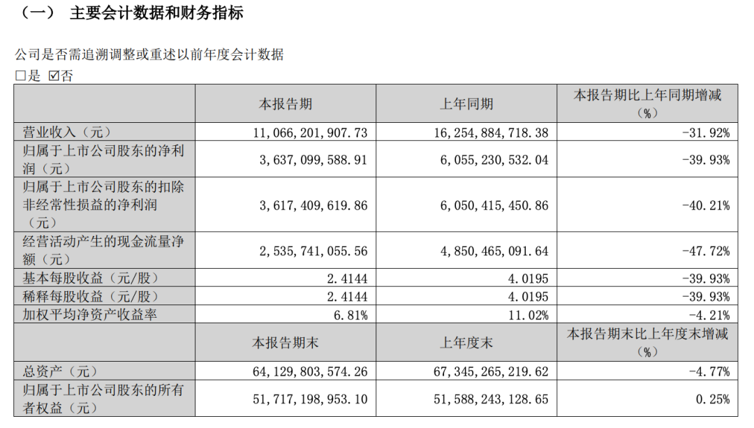 今年一季报的情况也差不多,一季度洋河股份营收110.66亿、同比下降31.92%,归母净利润36.37亿、同比下降39.93%,扣非净利润36.17亿、同比下降40.21%,经营现金流净额更是暴跌47.72%,所有核心指标只有净资产是在增长,但也只同比微增0.25%,其余指标全线下滑。