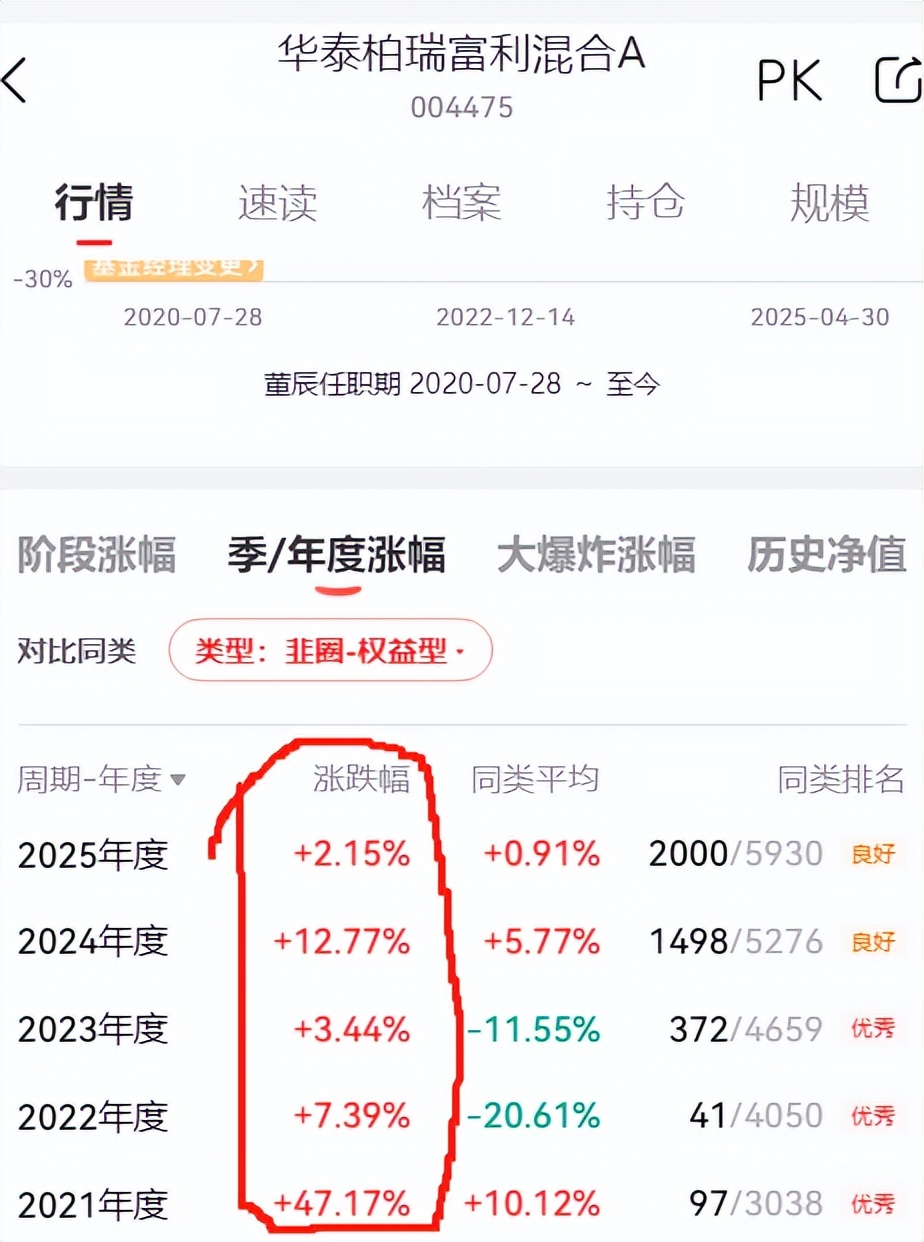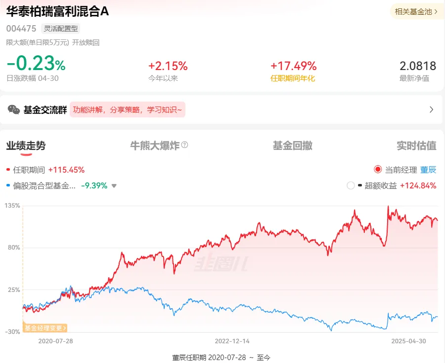 华泰柏瑞富利混合A董辰任职回报115.49%,同类排名3/3159。年度收益均为正,排名靠前。