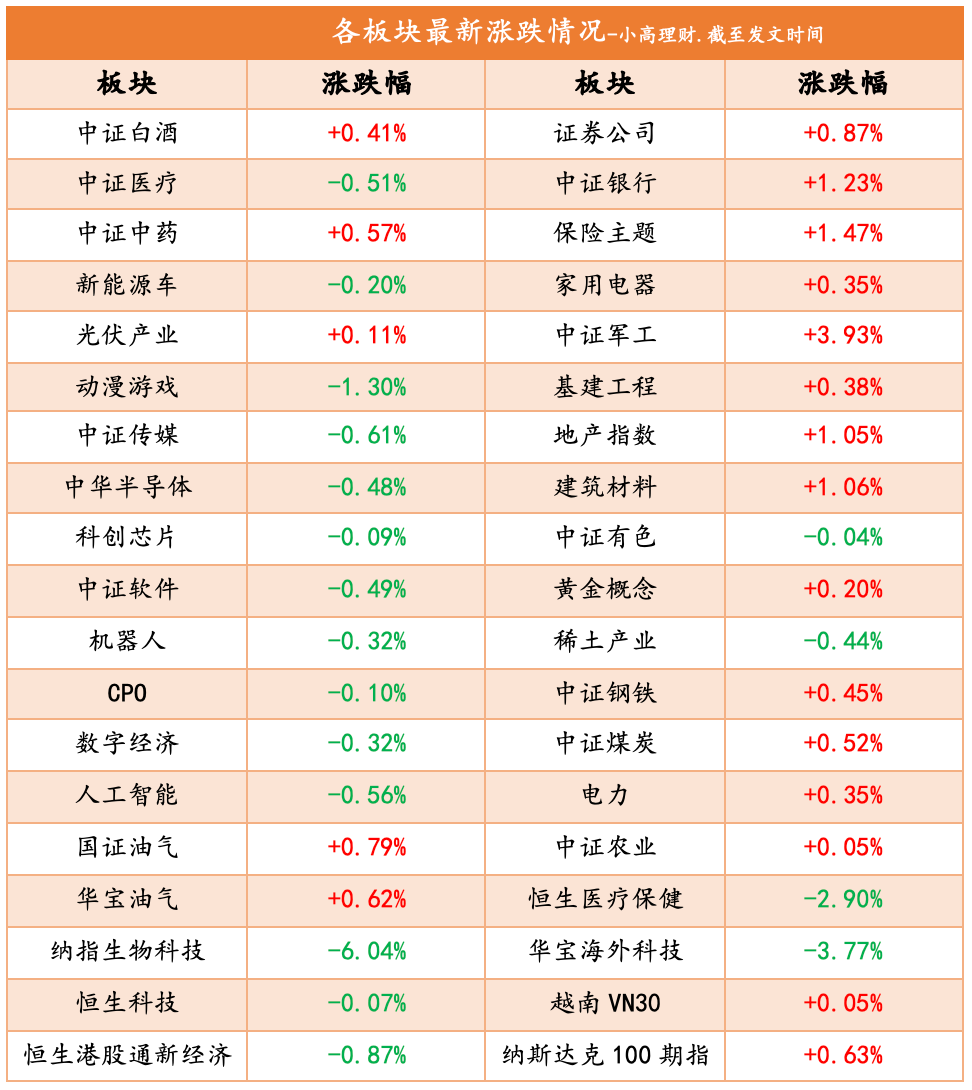 军工板块今天大涨超3%,小高持基盈利。券商板块今天上涨走势,小高多看少动。煤炭、稀土板块目前小涨小跌,小高不参与。农业板块今天窄幅波动,无操作空间。恒生港股今天高开低走,窄幅震荡,小高继续持基待涨。美股纳斯达克昨晚跌0.87%,小高计划明天定投!德国DAX指数昨晚跌0.41%,到前期高点附近了,有一定压力。越南市场昨天跌0.09%,多看少动。华宝海外科技昨晚跌3.77%,短期调整消化!