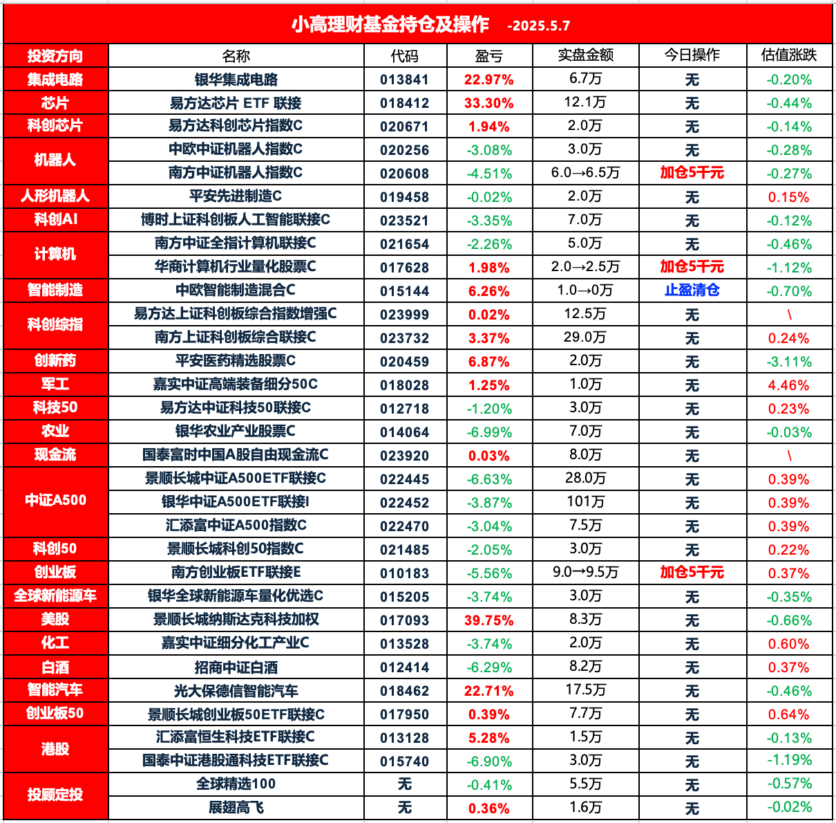 板块观点:白酒板块今天窄幅震荡,小高轻仓不动!医药板块今天涨跌分化,创新药未止跌,暂时不动。光伏、新能源车板块今天弱势震荡,小高持基观望!半导体芯片板块今天比较有韧性,小高继续持基!软件和数字经济板块今天震荡小跌,小高加仓华商计算机行业量化基金。游戏动漫板块今天下跌走势,小高多看少动。机器人板块今天窄幅震荡,小高加仓南方中证机器人基金。黄金板块今天冲高回落,小高保持观望!