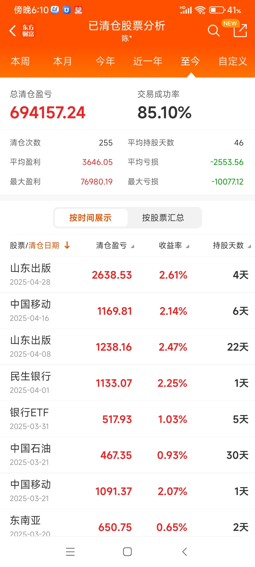 当前个股持仓账面是亏损状态,清仓个股大部分是盈利状态,至今业绩是盈利的。