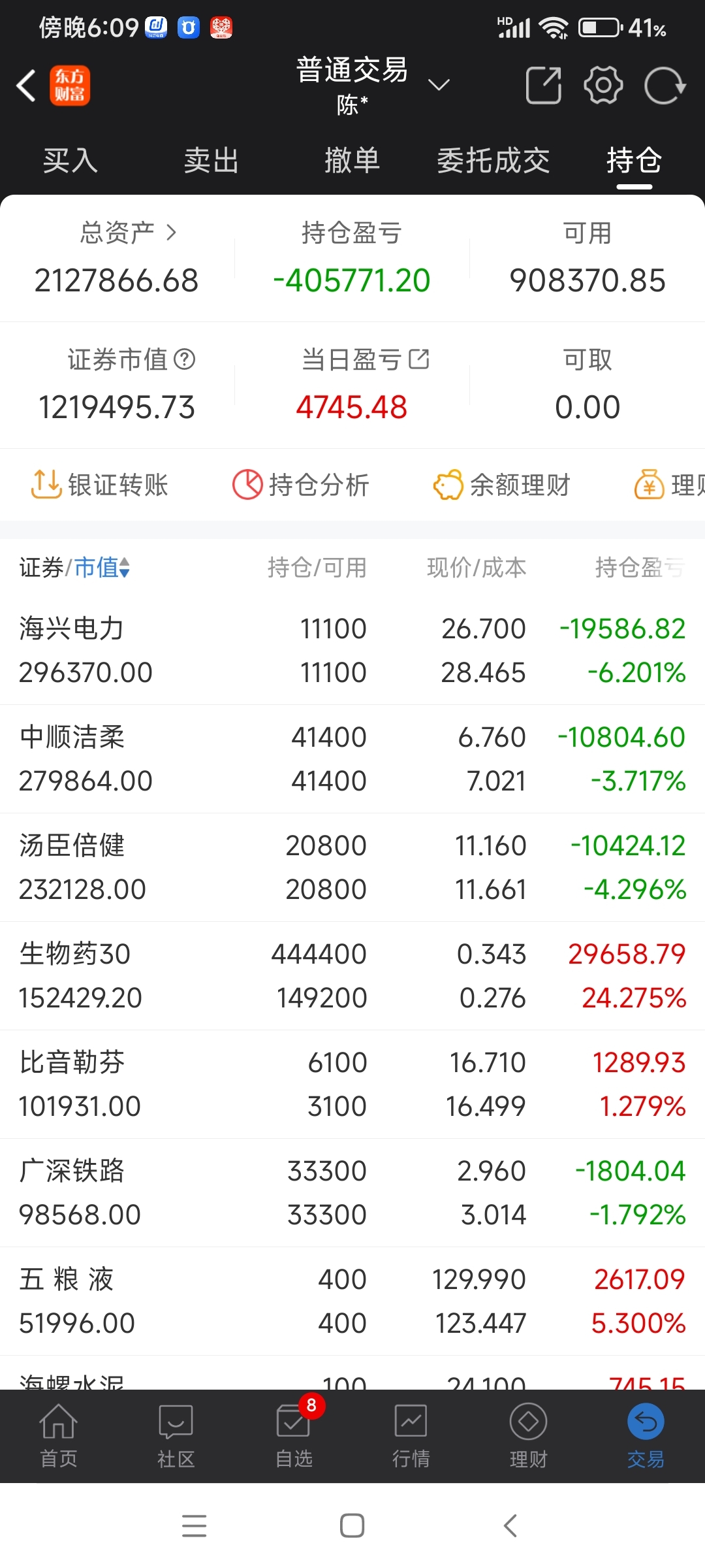 目前总市值,当日盈利,个股持有,实盘数据截图