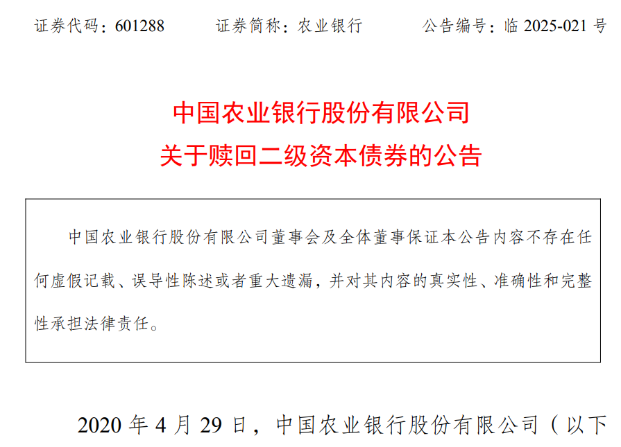 5月7日,农业银行发布关于赎回二级资本债券的公告。