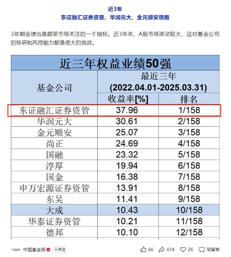 最近的三年可以说是一个熊市周期,我在基金报看到,2022年4月1日到2025年3月31日3年间,东证融汇证券资管旗下权益类基金(也就是我持有的东证融汇成长优选)平均收益率为37.96%,在纳入统计的158家管理人中排名第一。这个数据可以说是相当牛,为什么三年来持有它我从来也没操心过,收益率表现实在强,我这三年换过很多基金,一直持有没换的就是它了,让我在熊市周期也一直拿着它不放——就是因为它能给我赚钱。