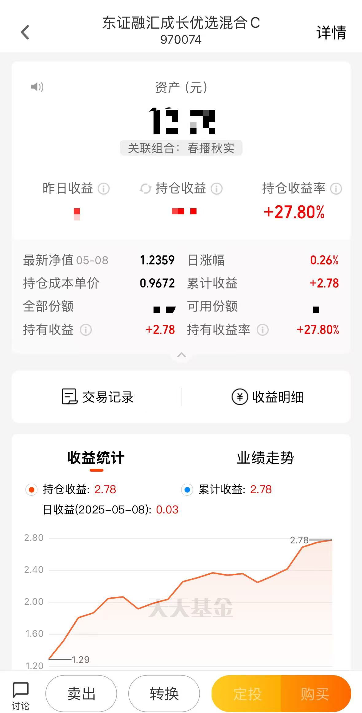 这次东证融汇成长优选合同到期未能续期,我是有点遗憾的,这么好一只基金,不能在继续持有了,吃肉吃习惯了,以后就没肉吃了。我持有它大概三年时间,期间虽然也因为外部环境因素出现过回撤,但它每次都能很快反弹上涨,不用漫长的等待煎熬它的修复。大多数时间,东证融汇成长优选的抗跌性是很强的,并且可以做到稳健上涨,这三年里随着它的上涨,我一直加仓追涨,综合收益还能达到8.86%,它本身近三年的涨幅是54.55%,非常厉害了。