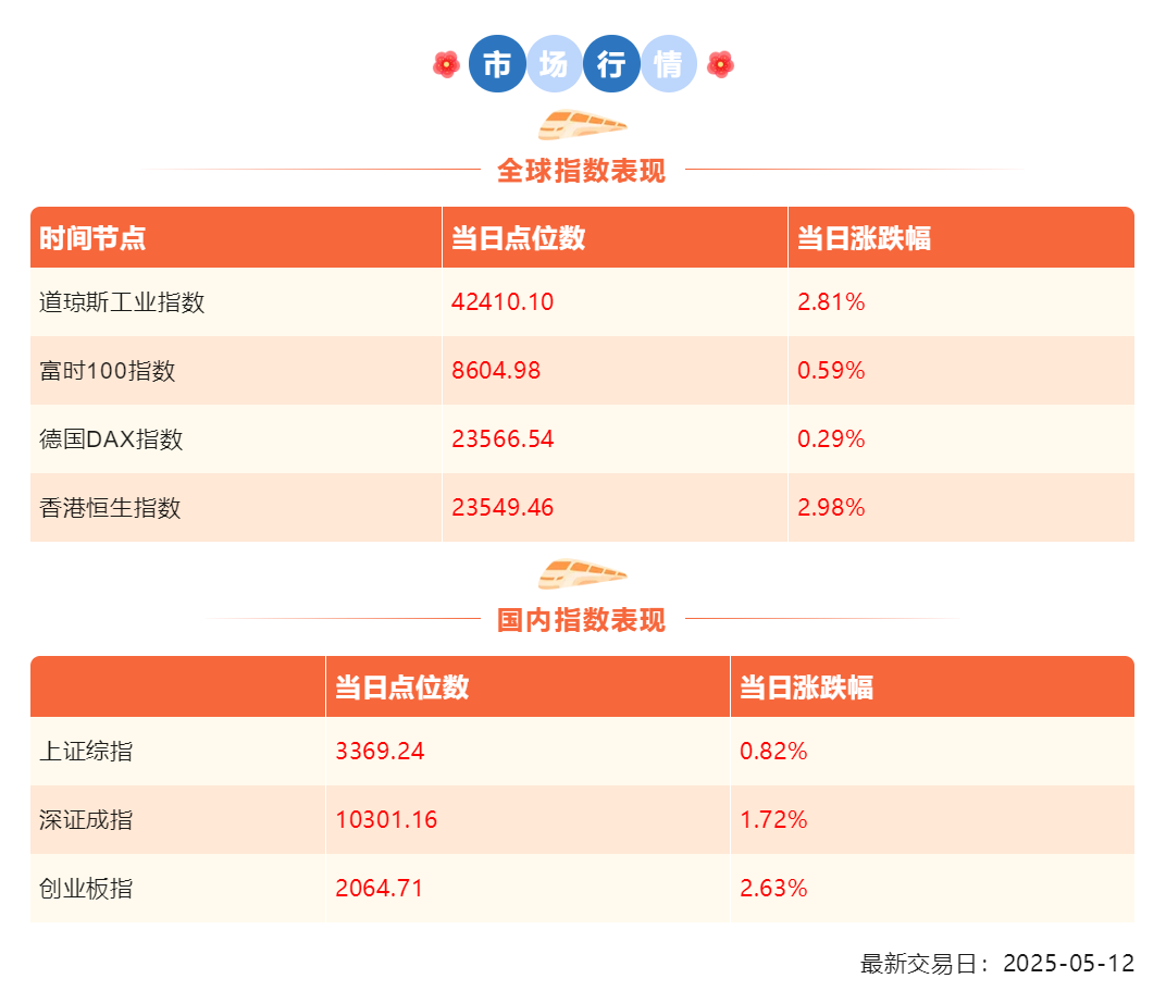 5月12日,A股在中美关贸易系缓和中普涨,成交量小幅增长。上证指数上涨0.82%,收报3369.24点;深证成指上涨1.72%,收报10301.16点;创业板指上涨2.63%,收报2064.71点;中证A500上涨1.26%,收报4583.19点。两市涨跌比3.7:1。个股中位数涨幅1.04%,赚钱效应强。沪深两市成交金额13084亿,较前一日放量1164亿。北向资金成交额1495亿元,南向资金大幅净流出185.28亿元。