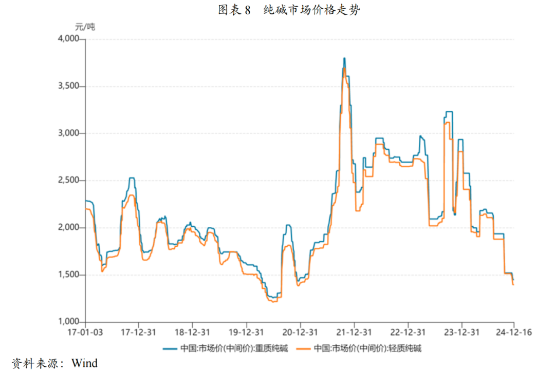 2022年以来,中国纯碱产能持续增长,2024年,我国纯碱有效产能约3970万吨,氨碱法、联碱法、天然碱法占比分别为47%、36%、17%,总需求量约3200万吨,呈现产能过剩局面。目前,国内纯碱行业有4家大型企业占据龙头地位,合计产能占全国的60%左右。纯碱下游消费结构主要是平板玻璃、日用玻璃、氧化铝、洗涤剂、化学品和其他等,2024年纯碱新增产能不断释放,市场供应显著增加,叠加下游光伏和浮法玻璃产线冷修集中,供强需弱,价格一路下滑。展望2025年,纯碱行业预计仍延续供需失衡格局,市场承压明显,供应端新增产能超300万吨,受房地产低迷及光伏玻璃产能过剩影响下游需求疲软,行业产能利用率或将有所下降,企业经营业绩预将承压。