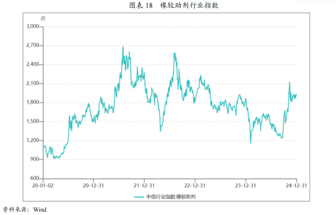 (6)橡胶助剂:2024年,中国轮胎产量增长带动橡胶助剂总产量及出口量均有所增长,但产品价格略有下降,未来行业产量有望持续提高,并将加速向环境友好型、高性能橡胶助剂产品结构转变。