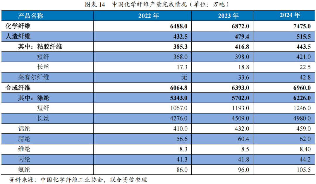 (4)合成纤维:2024年,化学纤维各品种产量均实现了不同比例的增长,化学纤维终端需求实现增长,但压力有所显现,涤纶长丝和氨纶等主要化学纤维品种仍处于价格低位,预计2025年,纺织品服装内销或将延续稳中承压态势,出口压力将明显增加,面临着竞争加剧、企业经营压力较大、贸易摩擦增多等问题。