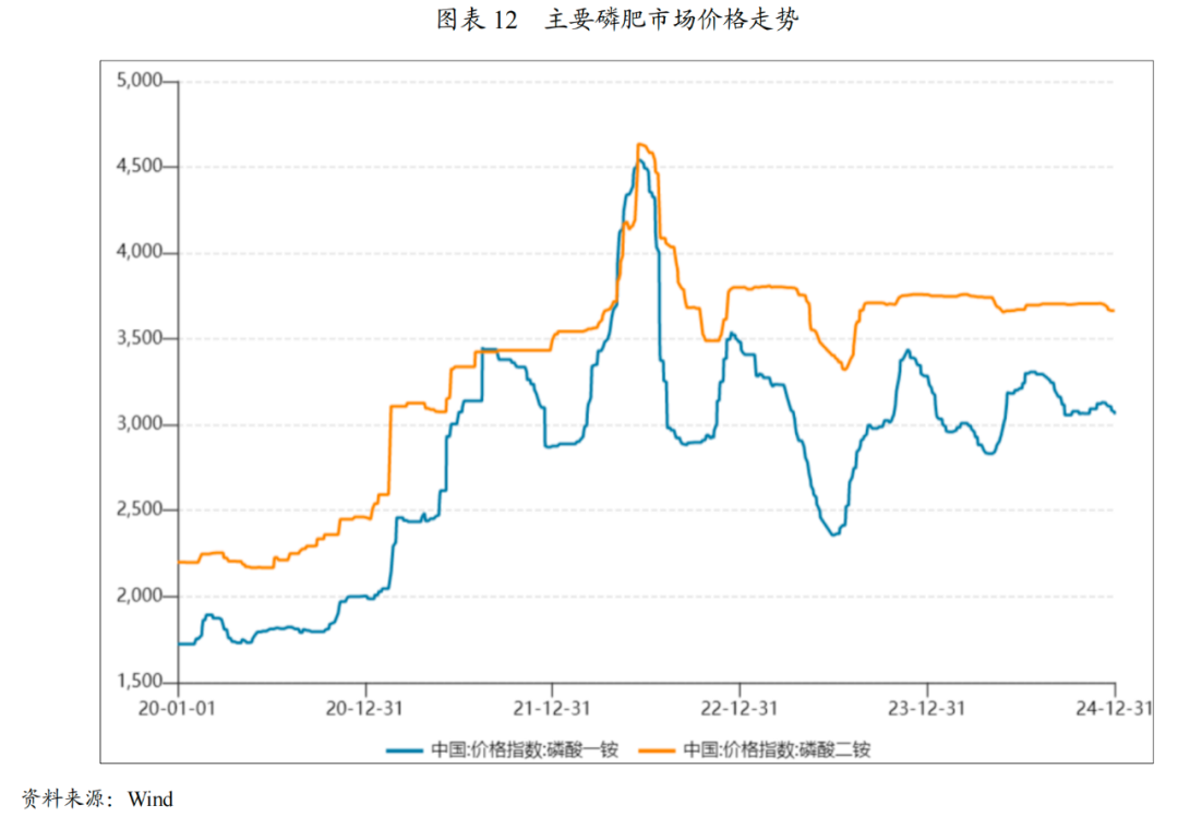 在能耗双控政策趋严,以及“三磷”治理等环保政策的强力推动下,磷肥行业资源自给率低、环保设施落后的企业逐步退出市场,2017-2022年磷肥行业进入产能出清周期,降至2120万吨/年,2023年,我国磷肥产能止跌回升,2024年5月29日,国务院印发《2024-2025年节能降碳行动方案》,要求严控磷铵行业新增产能。肥料级磷铵产能受限,但由于下游胺法路线制备磷酸铁需求,磷酸一铵中工业级产能略有增长,磷肥产量随着磷肥产能增长而有所提升,根据中商产业研究院数据,2024年中国磷酸一铵年度产量增至1130万吨,相比2023年增长5.9%;中国磷酸二铵产量达1395.56万吨,同比增长0.12%,供给端小幅增长,下游农业景气度较弱,但受磷矿石价格高企影响,磷肥价格整体处于高位小幅波动。