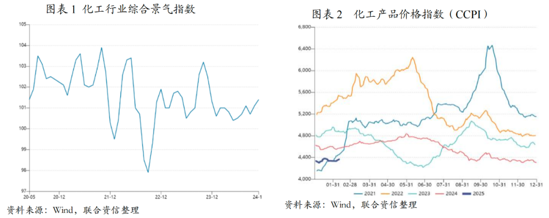 2024年,全球经济复苏缓慢,下游需求未有明显改善,化工产品价格下行,2024年CCPI年均值为4571点,较2023年下滑2.30%,较2022年下滑13.78%,价格指数处于近五年以来的低位,化工行业利润空间受到原材料高成本及需求不足的挤压,综合景气指数由2023年四季度的短暂高位后回落,并于2024年内窄幅波动。