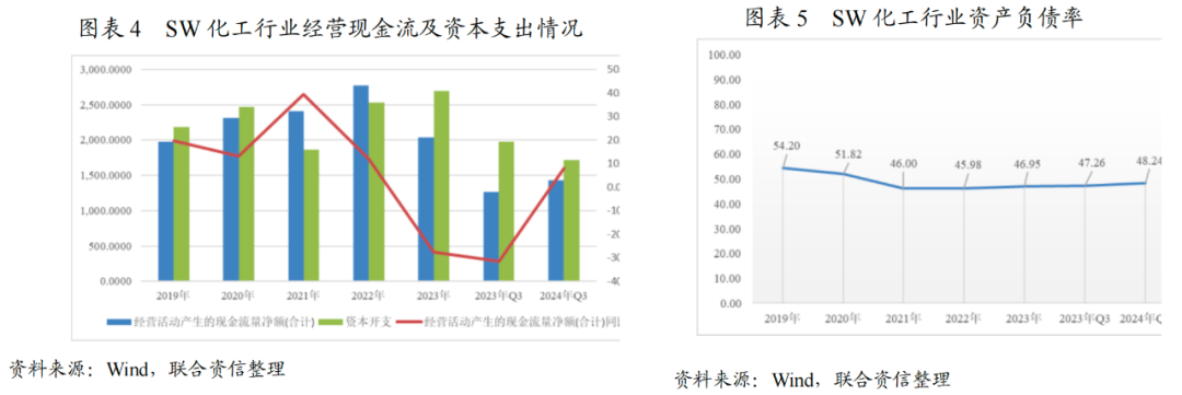 从样本企业(SW化工行业)财务表现来看,2024年,化工行业整体仍呈现增收不增利,2024年1-9月,SW化工行业实现营业总收入16476.80亿元,同比增长1.89%,实现净利润992.26亿元,同比下降5.00%。SW化工行业实现经营活动现金净流入1431.65亿元,同比增长7.93%,资本性支出金额由上年同期1974.22亿元下降至1717.45亿元,自由现金流量-285.80亿元,仍呈负值,但较上年同期-706.16亿元大幅缩窄。在资本开支扩张速度放缓的背景下,化工行业债务负担虽有所加重,但整体资产负债率仍较低。