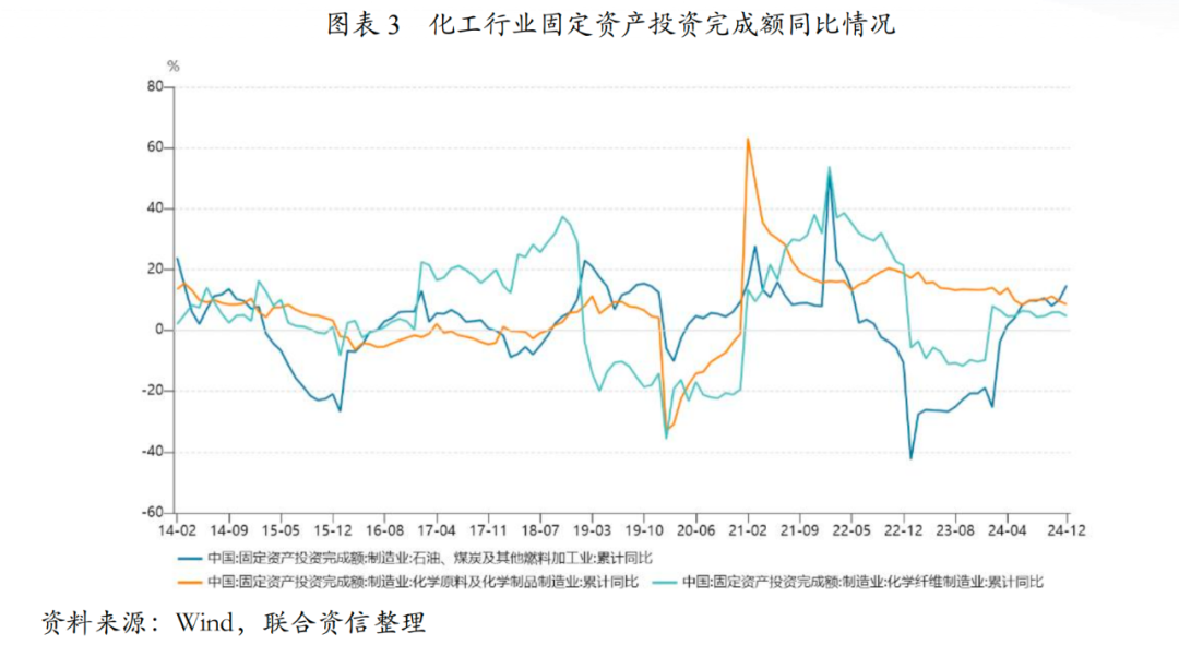 固定投资方面,2024年化工各主要子行业固定资产投资完成额由于2023年基数较低,均处于增长状态,但资本开支扩张速度较2021年高点有所放缓。2024年,石油、煤炭及其他燃料加工业固定资产投资同比增长14.80%,化学原料和化学制品制造业固定资产投资同比增长8.60%,化学纤维制造业固定资产投资同比增长4.70%。