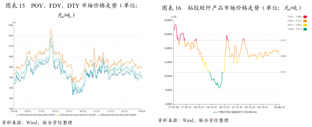 目前债券市场主要发债企业主要集中在涤纶、氨纶、粘胶纤维三个品种。2024年年初,由于原材料的价格上涨,涤纶长丝价格在一定程度呈现上涨趋势,但随着终端需求疲软的持续,涤纶长丝价格在第三季度和第四季度出现了回落。截至2024年底,POY、FDY和DTY主流市场价格分别约为7000元/吨、7475元/吨和8225元/吨,较年初下降550元/吨、700元/吨和625元/吨,整体价格处于历史较低水平。2024年,氨纶价格仍处于行业低位,延续单边下行的走势,受氨纶行业供大于求,竞争激励,叠加主要原料价格的下降,多数氨纶企业处于亏损状态。2024年,粘胶短纤行业供给稳定,3月份以后随着需求持续改善,市场震荡走强;下半年,在行业开工稳定、库存低位,以及下游需求保持刚需支撑影响下,加之原料溶解浆和液碱等化工原料价格从年中开始陆续上涨,在供应和成本的双重支撑下粘胶短纤价格持续上涨,价格整体处于高位。