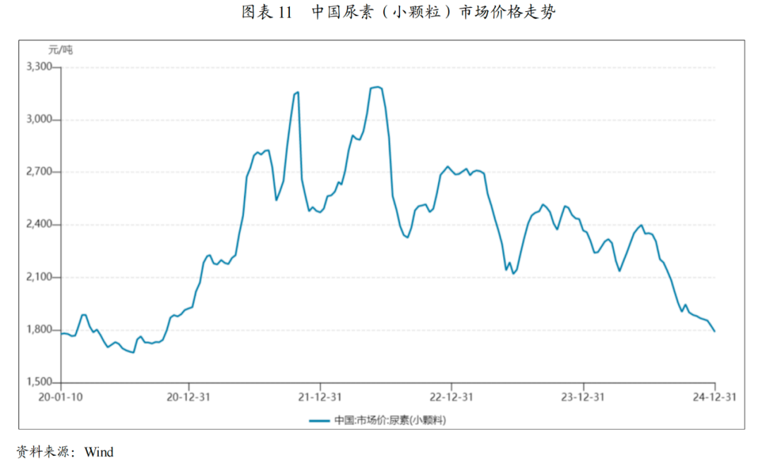 2024年,国内尿素价格整体呈下行趋势。上半年,受农业需求增长及工业需求中板材、家具出口带动,价格先抑后扬。下半年,受新增产能投放、煤炭价格中枢下移影响,叠加出口受限、粮食价格回落导致农业需求增幅放缓等因素,尿素价格持续下降并于年底跌至年内最低。