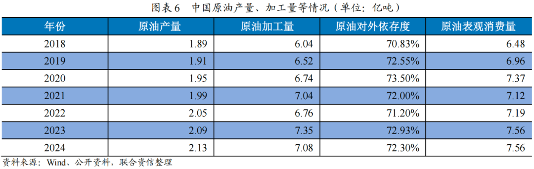 炼油产业链以原油、燃料油为原料,通过不同条件下馏分得到不同种类的成品油,同时炼油板块中的石脑油通过裂解得到不同的基础化工产品,按含碳个数分为乙烯、丙烯、碳四、碳五及芳烃产业链。近年来,随着中国大炼化项目的推进,炼油产能的持续增长,2020年中国炼油能力已超过8.5亿吨/年,接近美国9.0亿吨/年的炼化能力。近两年随着中国大型炼化项目的建设并逐步投产运营,而同期美国没有新增重大炼化项目且部分炼厂关停,中国的炼油能力已超过美国成为全球炼油能力最大的国家,2024年约9.55亿吨。2024年,中国原油加工量7.08亿吨,同比下降1.6%;原油表观消费量7.56亿吨,同比变动不大,主要系替代能源超预期发展,新能源汽车提速,LNG重卡快速渗透,导致石油消费增速显著放缓所致。2024年,中国原油产量2.13亿吨,接近历史峰值,同比增长1.91%,但相较于中国现有加工能力及加工量,每年仍需大量进口原油。近年来,中国原油对外依存度维持在70%左右。从成品油结构来看,2024年,中国成品油产量4.19亿吨,同比下降2.14%。其中,汽油产量1.61亿吨,同比小幅下降0.79%,柴油产量2.03亿吨,同比下降6.39%,主要系新能源汽车发展、其他清洁能源替代等因素所致;煤油产量0.56亿吨,同比增长12.02%,主要系国内外经济逐步恢复,航空、交通等领域对煤油的需求量逐渐增加所致;油品化率(成品油产量/原油加工量)59.18%,同比提高了0.95个百分点。从炼化化工产品来看,根据国家统计局数据,2024年中国乙烯产量3493万吨,同比增长9.51%,乙烯当量自给率从2018年的不足50%提高至近70%。