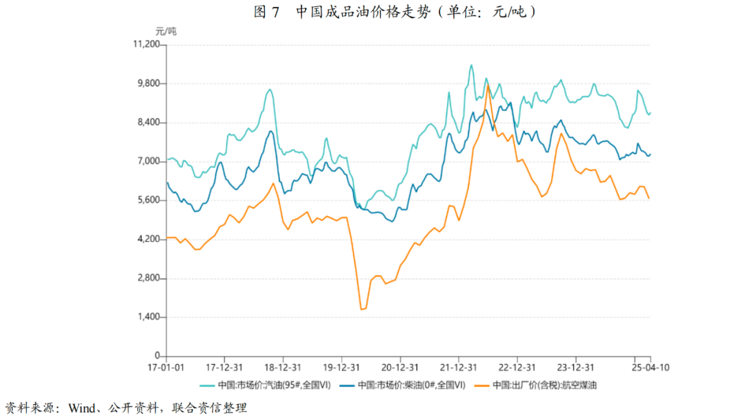 自2024年以来,国际原油价格整体呈震荡下行趋势,WTI原油全年波动区间为66-88美元/桶,同比下跌2.27%;进入2025年一季度,WTI原油季度均价71.42美元/桶,同比下降7.15%;4月受供应收紧预期提振,周线涨至63.75美元/桶,但较去年同期仍处低位。中国成品油走势趋同,整体波动幅度较小,有利于炼油厂利润修复。