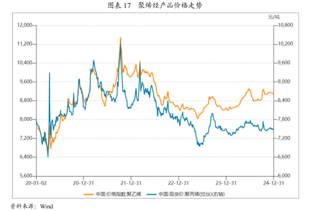 价格方面,2024年上半年,原油价格因OPEC+延长减产协议有所提高,叠加聚烯烃生产装置检修较多,中国聚烯烃价格持续走高。2024年下半年,原油价格下跌,叠加宏观经济恢复缓慢、需求走弱影响,聚烯烃价格有所回落。
