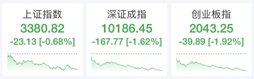 市场全天震荡调整,创业板指领跌。截至收盘,沪指跌0.68%,深成指跌1.62%,创业板指跌1.92%。个股跌多涨少,全市场超3800只个股下跌。