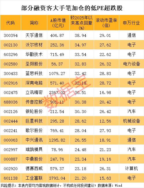 这些低市盈率的股票中,已有多只股票处于超跌状态。数据宝统计,以5月15日收盘价与年内高点相比,16股回撤幅度超20%。4只市值超千亿元的行业龙头股名列其中,分别是工业富联(19.220, 0.12, 0.63%)、立讯精密、中兴通讯(32.130, -0.04, -0.12%)、蓝思科技(21.930, 0.27, 1.25%)。