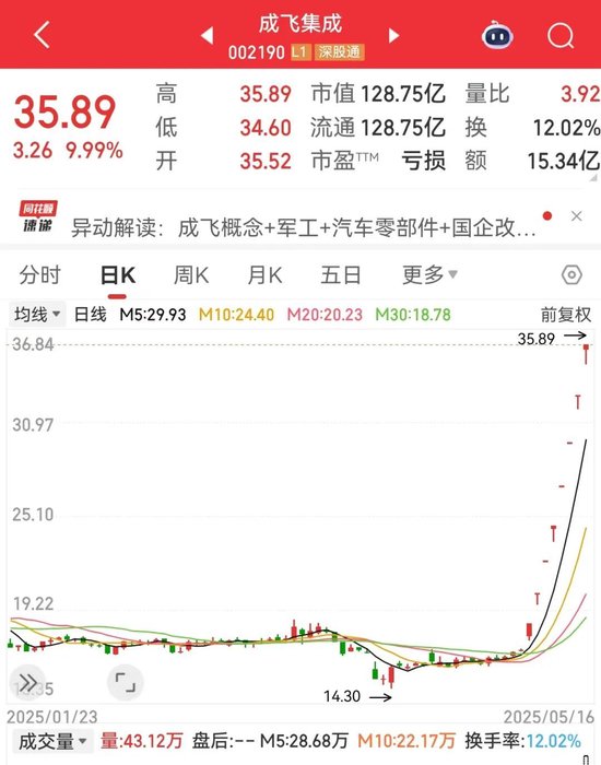 截至5月15日收盘,成飞集成5月以来累计涨幅96.33%,排在第一位。今日早盘该股再次涨停,迄今已连续收获8个涨停板,成为同期连续涨停板最多的股票。该股属于军工概念,实际控制人为中国航空工业集团有限公司。公司近日在股价异常波动公告中表示,目前主营业务以汽车零部件和工装模具为主,航空零部件业务为辅。经公司自查,目前生产经营活动一切正常,市场环境、行业政策没有发生重大调整,内部生产经营秩序正常。