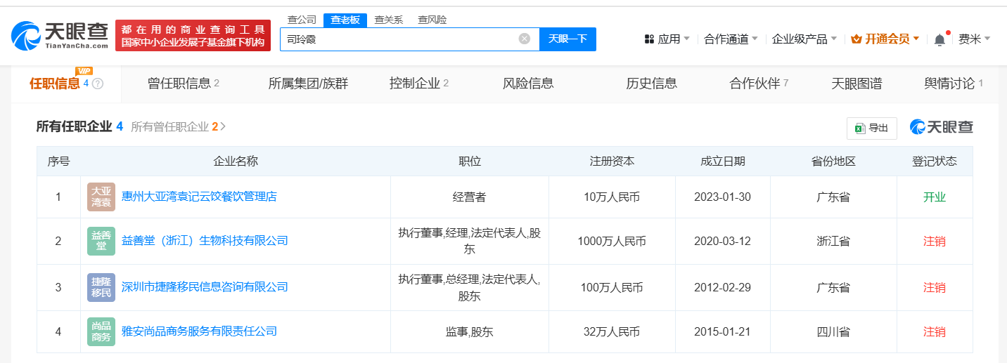 值得注意的是,5月14日,杨伟和司玲霞共同关联的益善堂(深圳)生物科技有限公司发生工商变更,该公司名称变更为深圳市水瓷慕美妆贸易有限公司,杨伟卸任法定代表人、执行董事、总经理并退出股东行列,司玲霞卸任监事。目前,司玲霞名下关联4家企业,仅1家餐饮管理店为开业状态,二人已无共同关联企业。