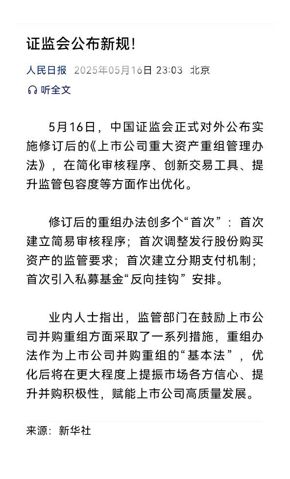 一万年太久,只争朝夕。股友们,温馨提示:1、5月16日,中国证监会发布了修改后的《上市公司重大资产重组管理办法》,建立重组股份对价分期支付机制,提高对财务状况变化、同业竞争和关联交易监管的包容度,对私募投资基金投资期限与重组取得股份的锁定期限实施“反向挂钩”,建立重组简易审核程序等,进一步深化上市公司并购重组市场改革。2、近日,国家数据局综合司印发了《数字中国建设2025年行动方案》,要求各地区结合实际认真贯彻落实。《行动方案》是国家数据局首次向地方数据管理部门印发的指导开展数字中国建设的文件。3、突然改口,美国关税政策再度传来变数。当地时间5月16日表示,未来两到三周内,美国可能会单方面对许多贸易伙伴设定新的关税税率。4、俄乌会谈成果寥寥!又来威胁:或对俄实施新制裁。5、胖东来深夜发布回复说明!接受任何核查,但绝不容许造谣、诽谤,要做玻璃般透明的企业。