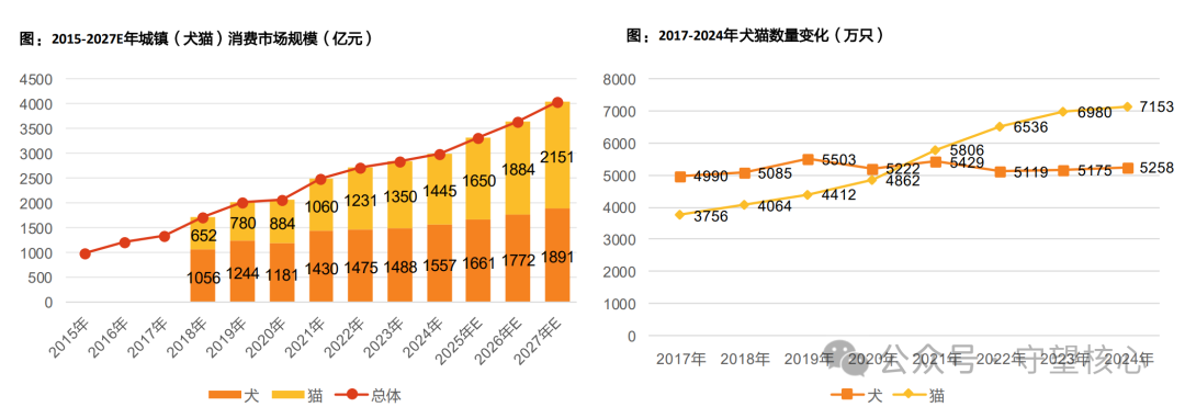 2、市场规模与增速:2024年城镇犬猫消费市场突破3000亿元,整体经济从不到千亿快速成长到3000亿水平,未来破万亿值得期待。