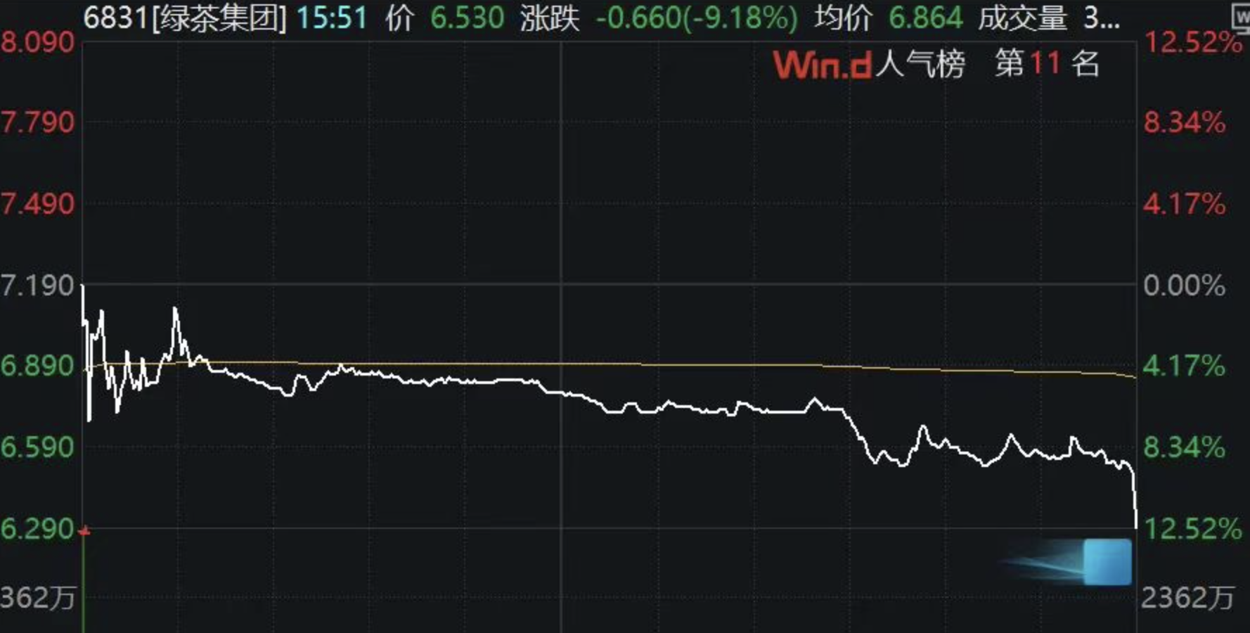 5月16日,历经五次递表的绿茶集团,终于成功登陆港交所。尽管其联席保荐人招银国际,利用绿鞋机制(超额配售选择权)全力护盘,但仍没能阻挡上市首日即破发的势头,股票跌幅达12.52%,股价由发行价7.19港元/股,一路跌到6.29港元/股收盘,首日市值即缩水约6亿港元。