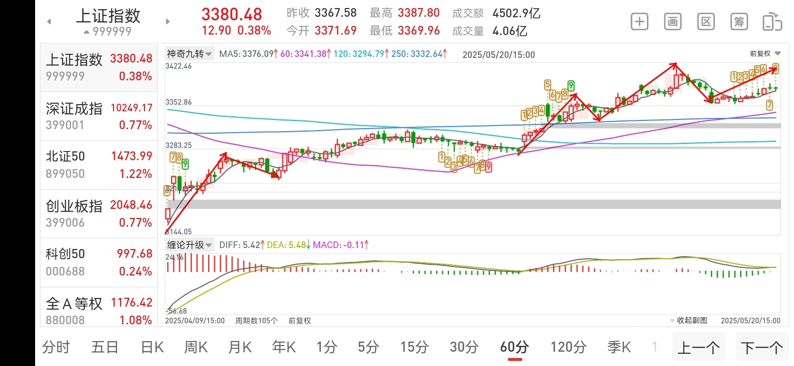 根据以上60分钟走势图来看:指数突破60移动平均线,结合下方!MACD红绿柱来判断:5浪上涨中!至于能不能有效突破3浪高点3417点,重点看成交量能不能补量1.5万亿之上才有承接力度!