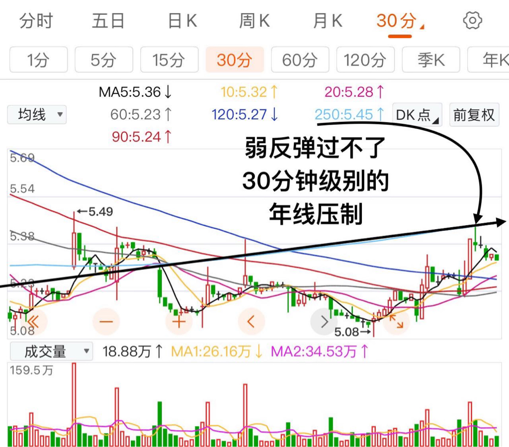 永辉超市的基本面这篇文章就不分析了,今日收5.34元,微涨1.14%,从30分钟级别K线图上看,盘中最高点正好触及其年线后回落。本人认为这只是一个弱势反弹,不能抱有太高预期。