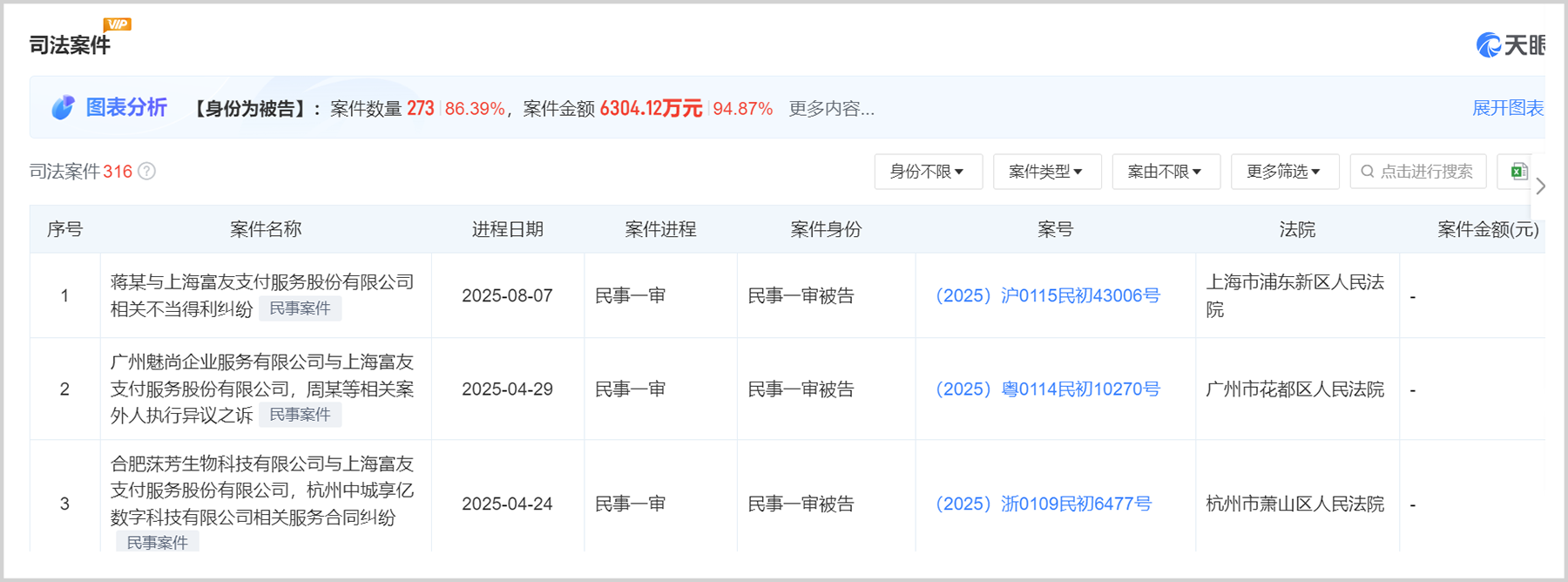虽然从2019年开始富友支付大规模终止与P2P平台合作,但富友支付仍深陷于47起相关诉讼的泥潭。尽管这其中39起案件已和解并且公司声称都是“无赔偿责任”,但截至2025年5月,仍有8起相关的未决诉讼。天眼查显示,截至目前富友支付作为被告的未决诉讼有273个,涉案金额超6300万元。