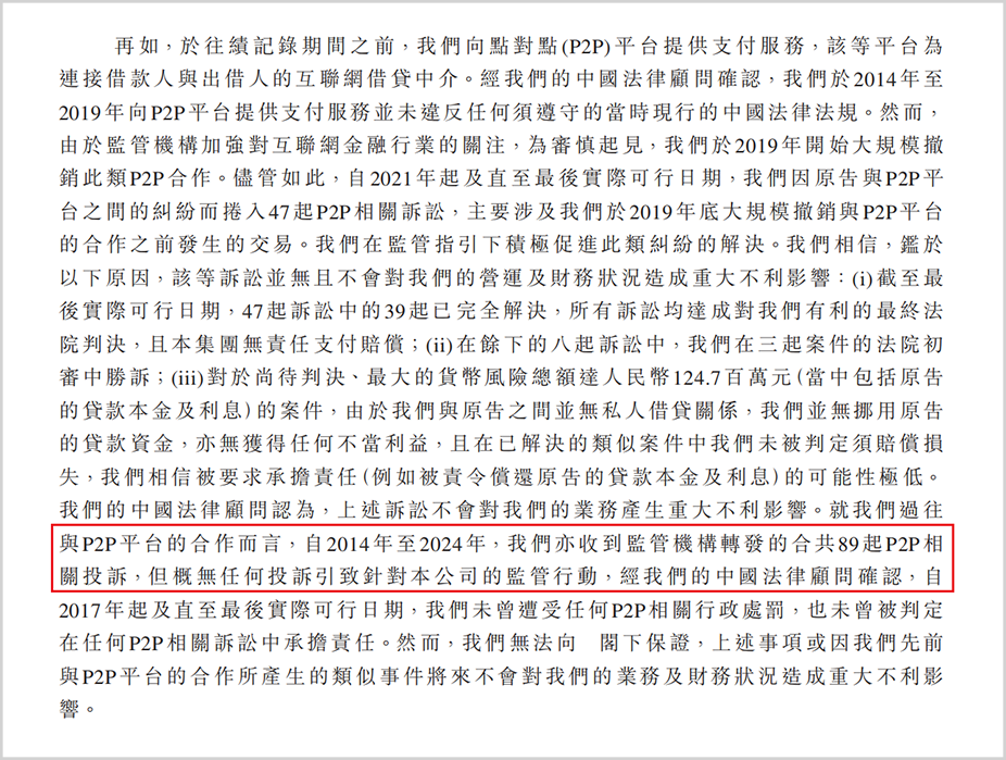 更严重的是,其曾为虚假股票交易平台“杭州众银”及套路贷APP提供支付通道,被最高检、公安部公开通报,成为行业负面典型。据招股书披露,2014-2024年间公司收到89起P2P相关投诉,虽未直接引发监管处罚,但已实质性损害金融机构合作信任度。