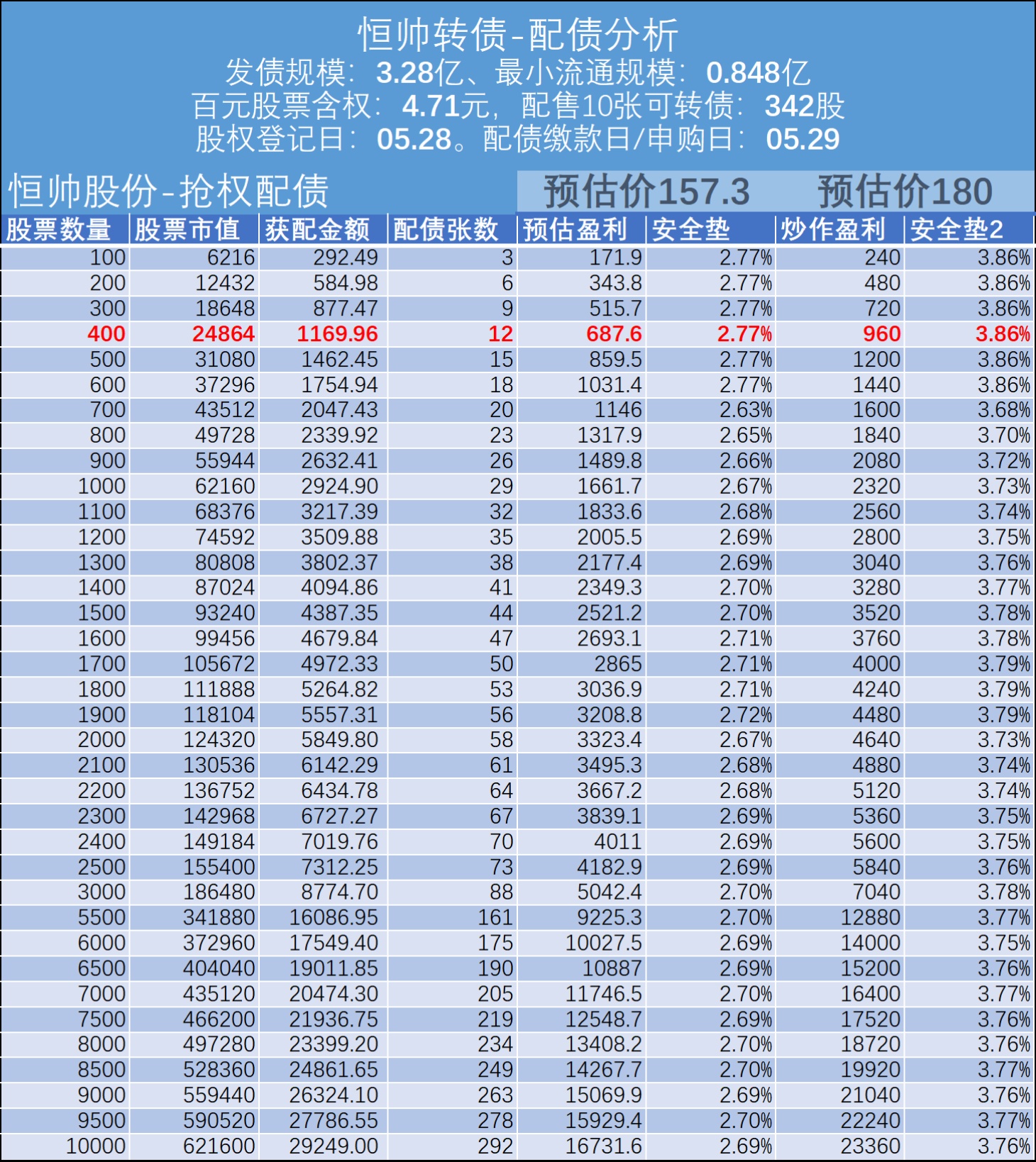 2、恒帅转债 抢权配债表。