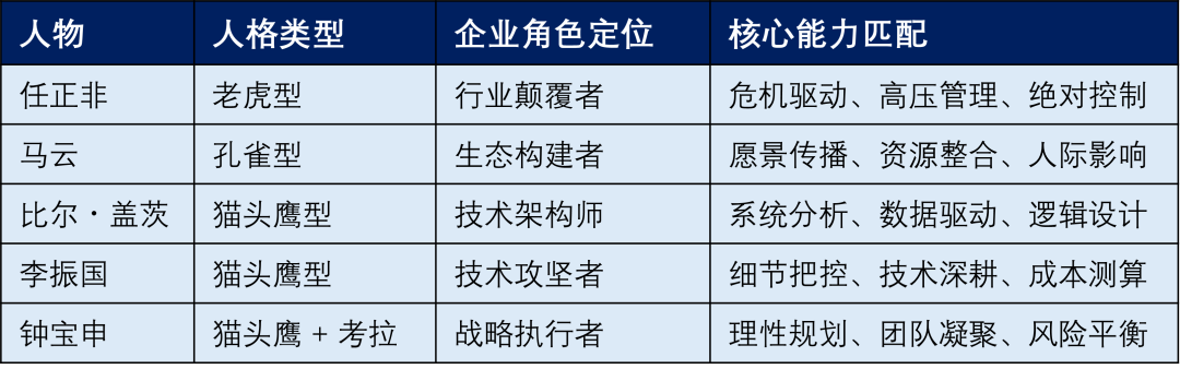 老虎型(任正非)与孔雀型(马云)是 “规则破坏者”,擅长开辟新赛道;而猫头鹰型(李振国、比尔盖茨)与猫头鹰型兼考拉型(钟宝申)是 “规则优化者”,专注在既定赛道中做到极致。