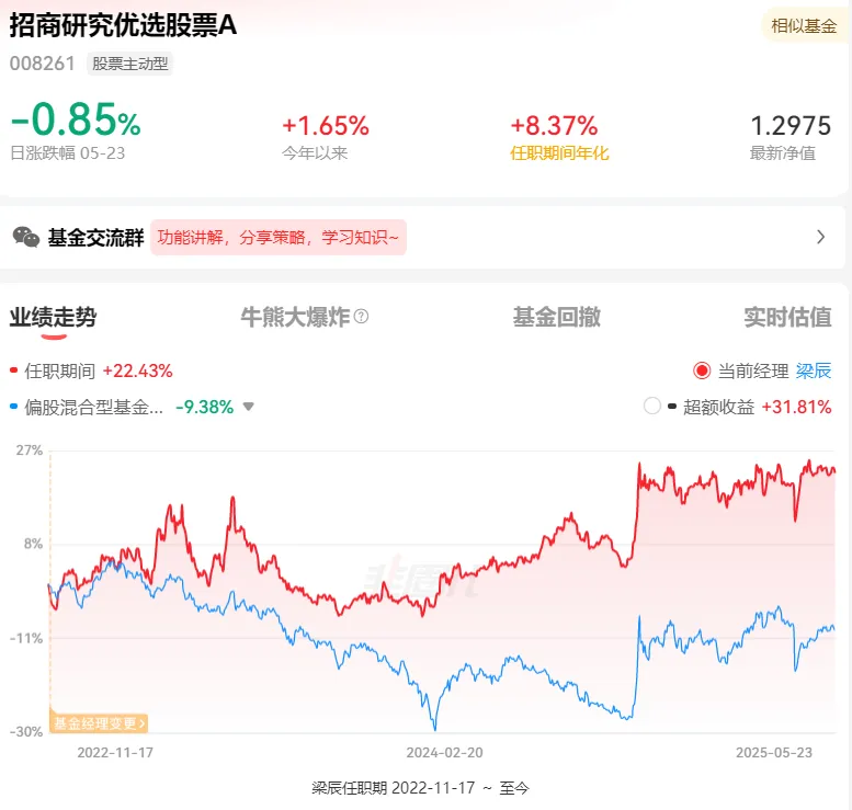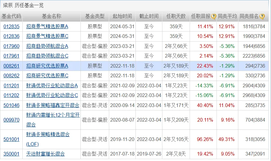 招商研究优选梁辰任职回报22.43%,同类排名294/2736。跑赢偏股混合型基金指数。2023年和2024年同类排名优秀,2025年同类排名良好。
