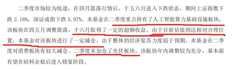 二季度重点持有了人工智能算力基础设施板块,于六月取得了一定的超额收益,由于目前估值达到相对合理位置,本基金对该板块进行了一定减仓。二季度末加仓了光伏板块。