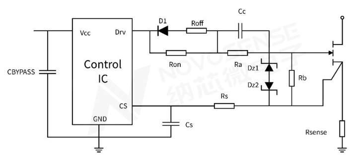 以上阻容分压电路尽管对驱动芯片要求不高,但由于驱动回路元器件数量较多,容易引入额外寄生电感,会影响GaN在高频下的开关性能。此外,由于阻容分压电路的关断负压来自于电容Cc放电,关断负压并不可靠。