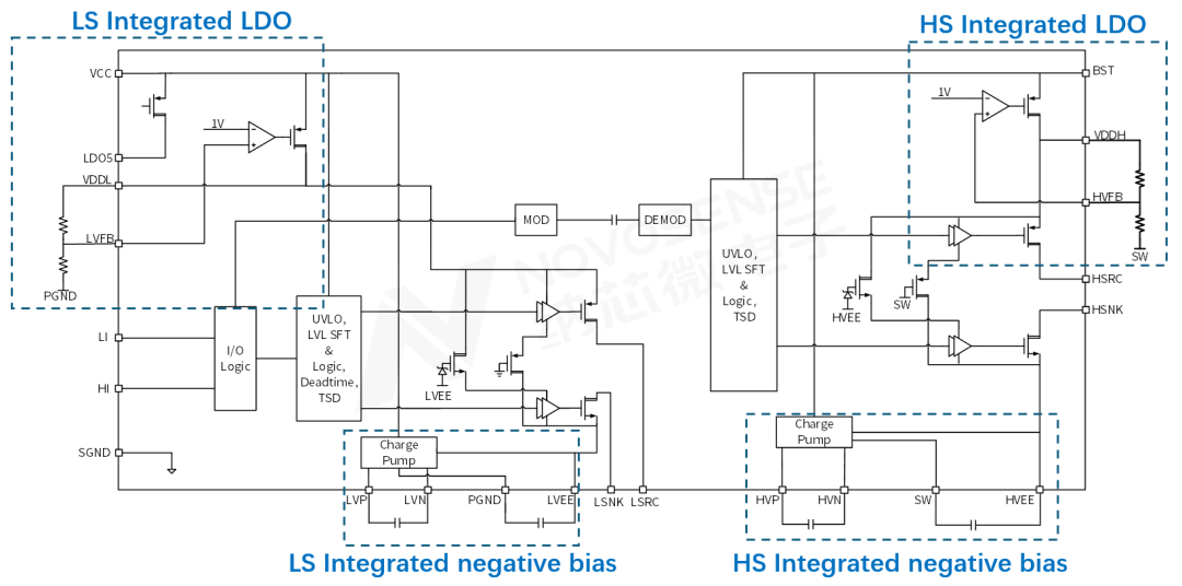 NSD2622N是一款专为E-mode GaN设计的高压半桥驱动芯片,该芯片内部集成了电压调节电路,可以生成5V~6.5V可配置的稳定正压,从而实现对GaN器件的可靠驱动;内部还集成了电荷泵电路,可以生成-2.5V的固定负压用于GaN可靠关断。该芯片由于将正负电源稳压电路集成到内部,因此可以支持高边输出采用自举供电方式。