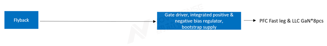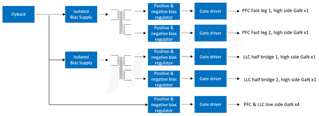 如果采用NSI6602VD驱动方案,需要配合相应的隔离电源电路与正负电源稳压电路,意味着每一路半桥的高边驱动都需要一路独立的隔离供电,所以隔离辅助电源的设计较为复杂。鉴于GaN驱动对供电质量要求较高,且PFC和LLC的主功率回路通常分别放置在独立板卡上,因此,往往需要采用两级辅助电源架构,第一级使用宽输入电压范围的器件如flyback生成稳压轨,第二级可以采用开环全桥拓扑提供隔离电源,并进一步稳压生成NSI6602VD所需的正负供电电源,以下为典型供电架构: