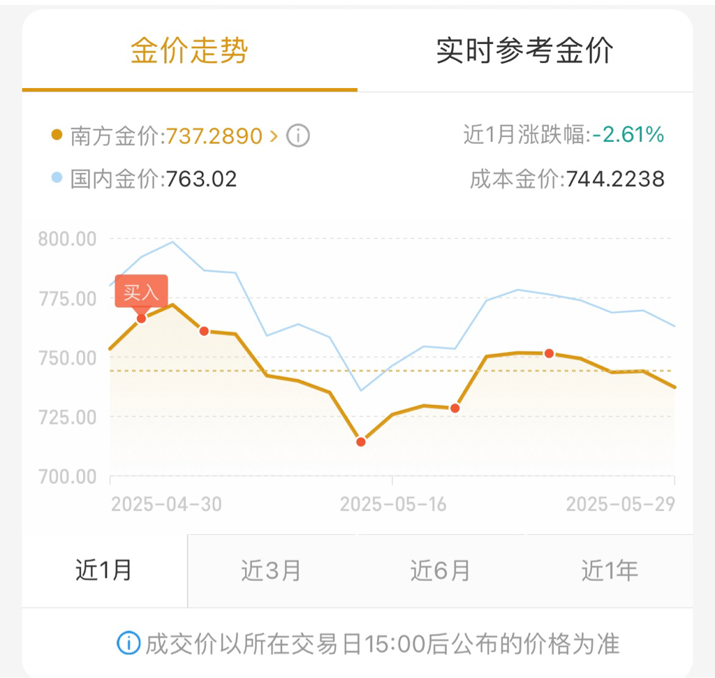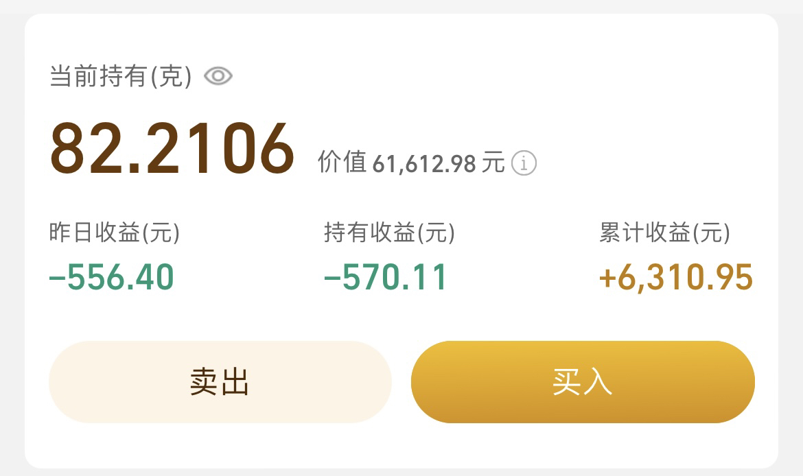 个人为例,目前我持仓大概是6W黄金,短期来看波动加大,个人尽可能地不追涨,有大幅波动跳水前提下,个人果断加仓,比如5月15日直接干了10,000,尽可能地降低持仓成本。