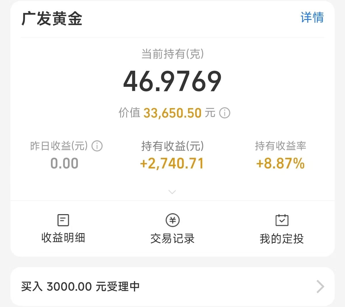 $广发上海金ETF联接C$加仓3000元,今天黄金再次大涨,上海金盘中涨超2%,指数已经连续上涨两天。地缘因素不确定也使得投资者转向黄金进行避险。关税的反复也让市场对贸易不确定引发担忧,对黄金走势形成支撑。再一个全球央行也在持续购买黄金,美元信用弱化,后续黄金依然值得期待,黄金和股市债市关联度较低,能够稳定持仓,所以小白白今天打算顺势而为,继续加仓。
