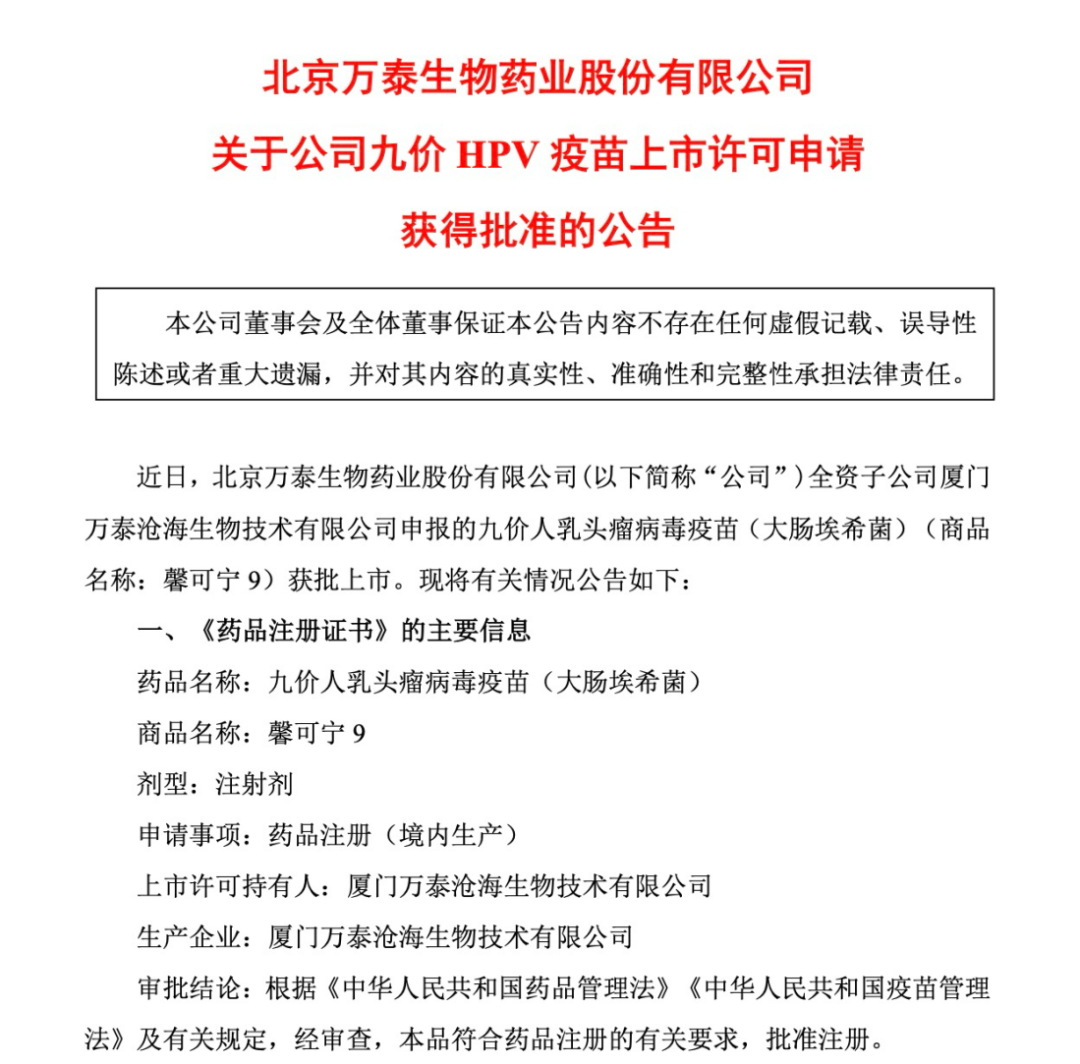 【导读】万泰生物全资子公司申报的九价人瘤病毒疫苗获批上市