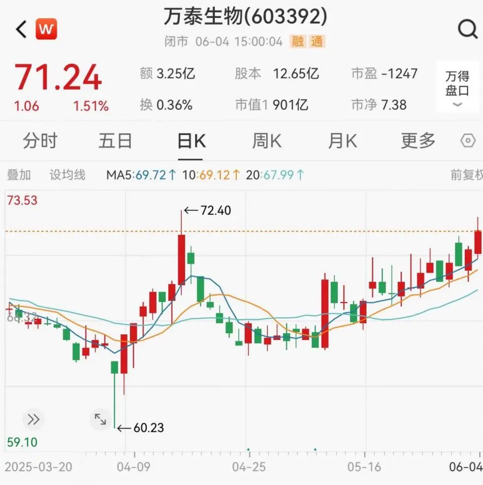 截至6月4日收盘,万泰生物报71.24元/股,上涨1.51%,总市值为901亿元。