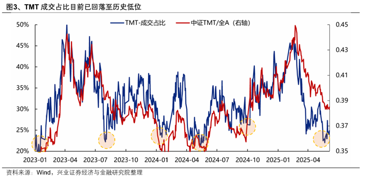从衡量板块交易火热程度的成交占比来看,兴业证券指出,当前TMT成交占比目前已经回落至22%、23%左右的历史低位,甚至低于2023年和2024年多数科技风格调整到位时的水平。这也意味着,目前资金筹码较轻的TMT板块,更容易在增量资金的带动下,迸发出强爆发力。