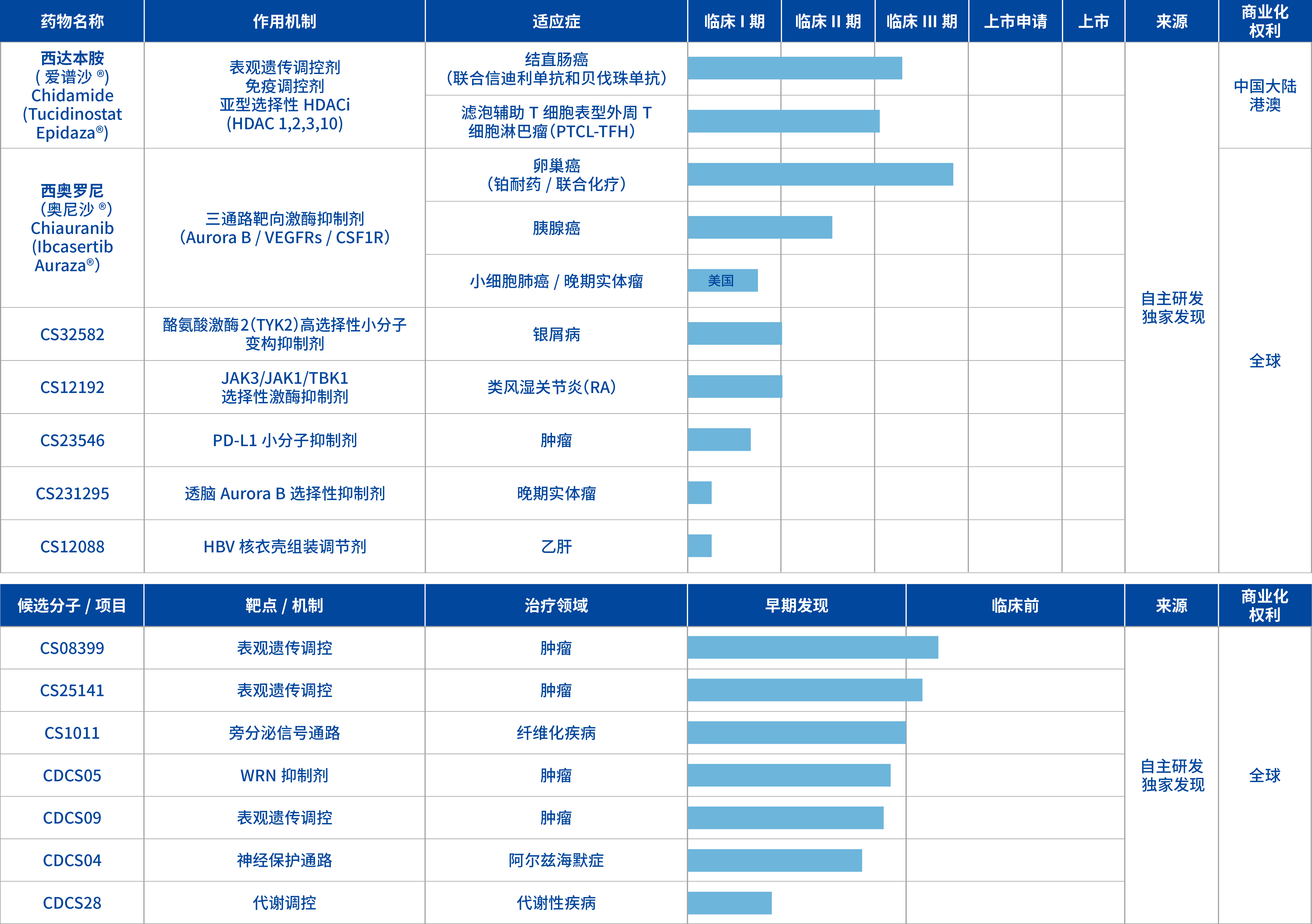 西奥罗尼单药治疗复发难治小细胞肺癌/晚期实体瘤(美国,公司100%股权)II期十二个临床试验中心推进中;CS23546(PD-L1 小分子抑制剂)的适应症为治疗晚期肿瘤,还包括其他由PDL1信号介导的免疫相关疾病,计划申报美国临床试验;CS231295片治疗多种实体肿瘤,尤其是脑部肿瘤方面,预计会显示出独特的优势和潜力,计划申报美国临床试验。公司国际合作伙伴HUYABIO(沪亚生物国际)在全球17个国家开展的西达本胺联合纳武利尤单抗一线治疗晚期黑色素瘤的三期临床试验已完成入组。